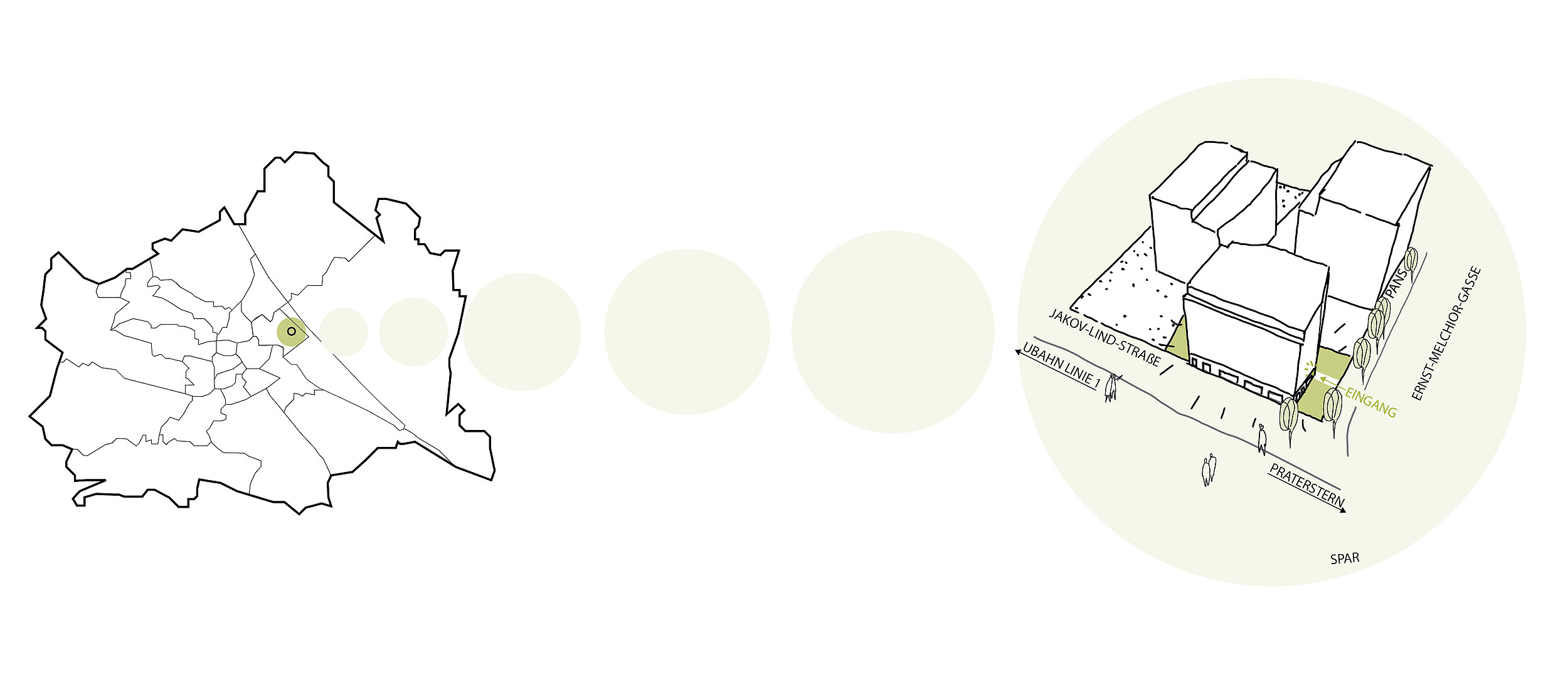 U1 Vorgartenstraße und von dort zu Fuß ca. 5 min bis in unser Büro: folgen Sie der Radingerstraße, durch die Leopold-Schillinger-Gasse in Richtung Rudolf-Bednar-Park. Hier biegen Sie nach links ab und gehen den Park entlang bis Sie unser Büro im EG an der Ecke Jakov-Lind-Straße und Ernst-Melchior-Gasse erreichen.
