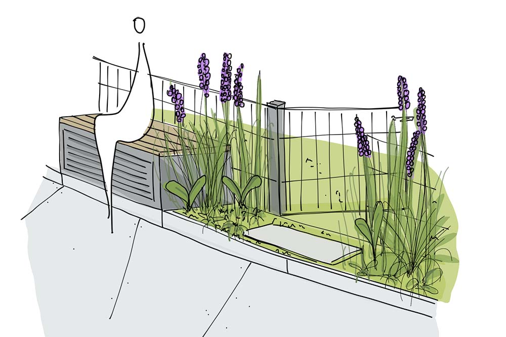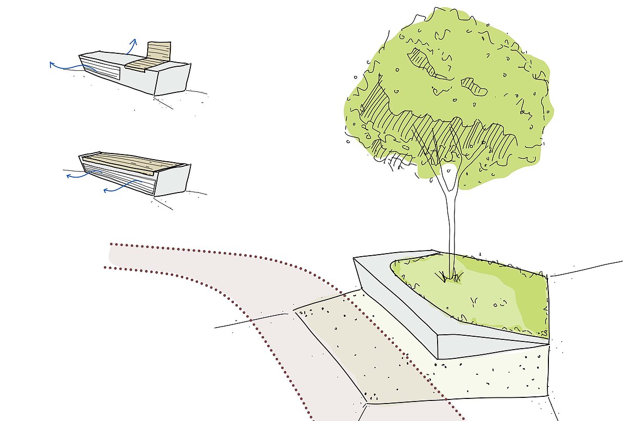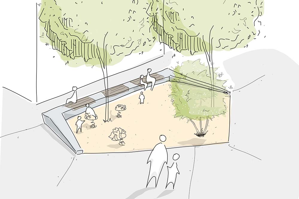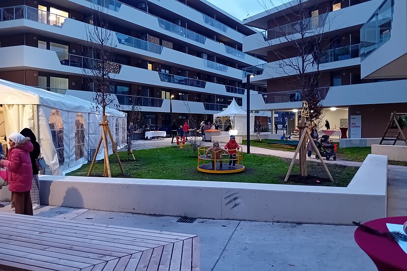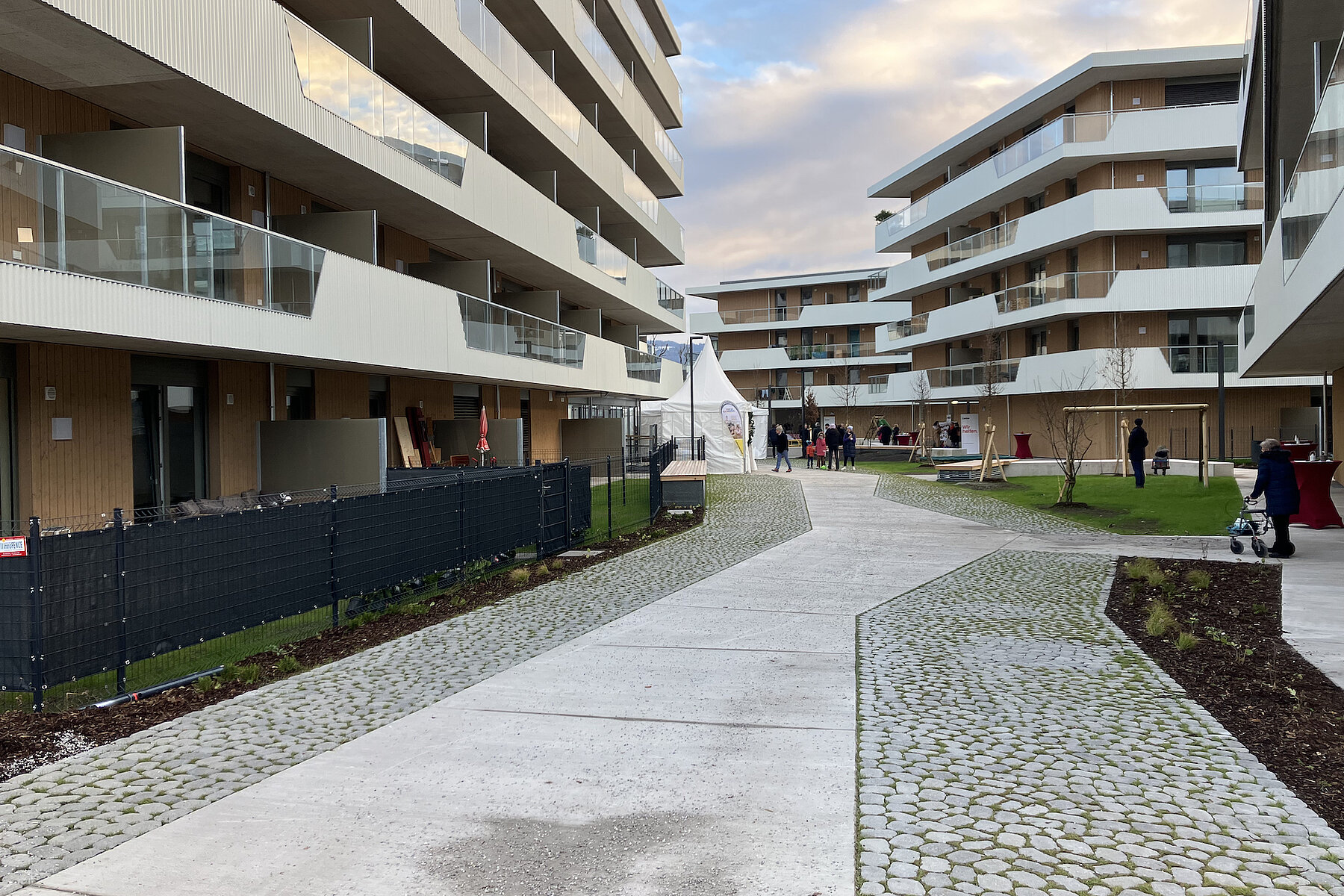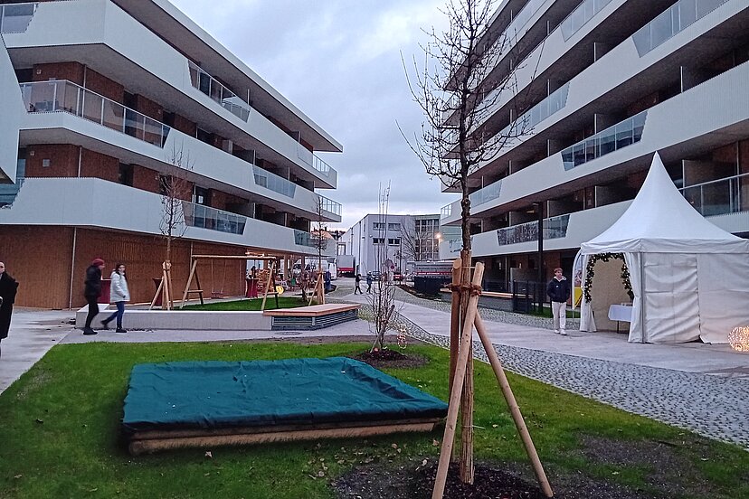 Die neue Wohnanlage zeigt einen sensiblen Umgang mit privatem und öffentlichen Freiraum auf. Den Wohnungen im Erdgeschoss werden Gärten vorgelagert, die zum halböffentlichen Quartiersplatz im Zentrum der Bebauung ausgerichtet sind. Dieser Platz wird von gemeinschaftlich genutzten Räumen umspielt und belebt. Hier befinden sich reichlich Sitz- und Liegemöglichkeiten (Sitzbänke, Hängematten, Trinkbrunnen sowie ein reichhaltiges Spielangebot, das in unterschiedliche Themenschwerpunkte unterteilt wurde. Diese Spielinseln laden sowohl Kleinkinder als auch Jugendliche zum Balancieren, Klettern, Erholen oder Sandspielen ein. Der überdachte Aktivbereich im Norden mit Kletterseilen ist auch bei Schlechtwetter nutzbar. Besonderer Wert wurde bei der Wegegestaltung auf die Reduktion des Versieglungsgrades sowie auf die Nutzung heller Oberflächen gelegt. So werden die Hauptwege mit hellen Ortbetonfeldern ausgestaltet und die Nebenflächen mit durchlässigen Materialen zur Verbesserung der Speicherfähigkeit und Verdunstung. Neben befestigten Flächen begleitet eine natürliche Stauden- oder Heckenbepflanzung die barrierefrei ausgestalteten Wege und schafft eine offene kommunikative Atmosphäre und weiche Übergänge zwischen privat und gemeinschaftlich genutzten Flächen. Eine Folge von grünen Inseln bildet interaktive Kreuzungspunkte mit unterschiedlichen Funktionen aus. Im Osten des Grundstücks soll der Bach renaturiert und zugänglich gemacht werden.