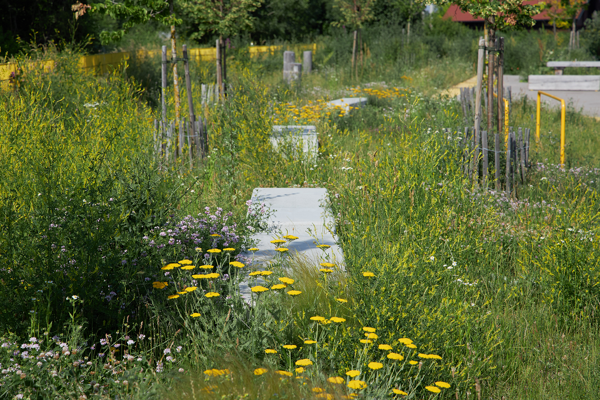Ein fließender Raum mit einer semipermeablen Haut (Zaun) lädt zum Spielen, Erholen, Bewegen und Natur Erleben ein. JUL ist Programm und Form zugleich. Sanfte Schwellen zwischen den Nutzungsbereichen arbeiten mit Aspekten der sozialen Interaktion und gendergerechter Planung. Der Bestandsasphalt korrespondiert mit den Aktivitäten. Das Durchschneiden mit Gestaltungsbändern aus Möbel, Bodenmarkierung und Pflanzen definiert erkennbare Teilbereiche. Der Jugendspielplatz deckt jedes Angebot ab von Rollsportarten, Fitness und Ballspiel bis hin zu Wiesen Loungebereichen zum Abhängen in den Hängematten.