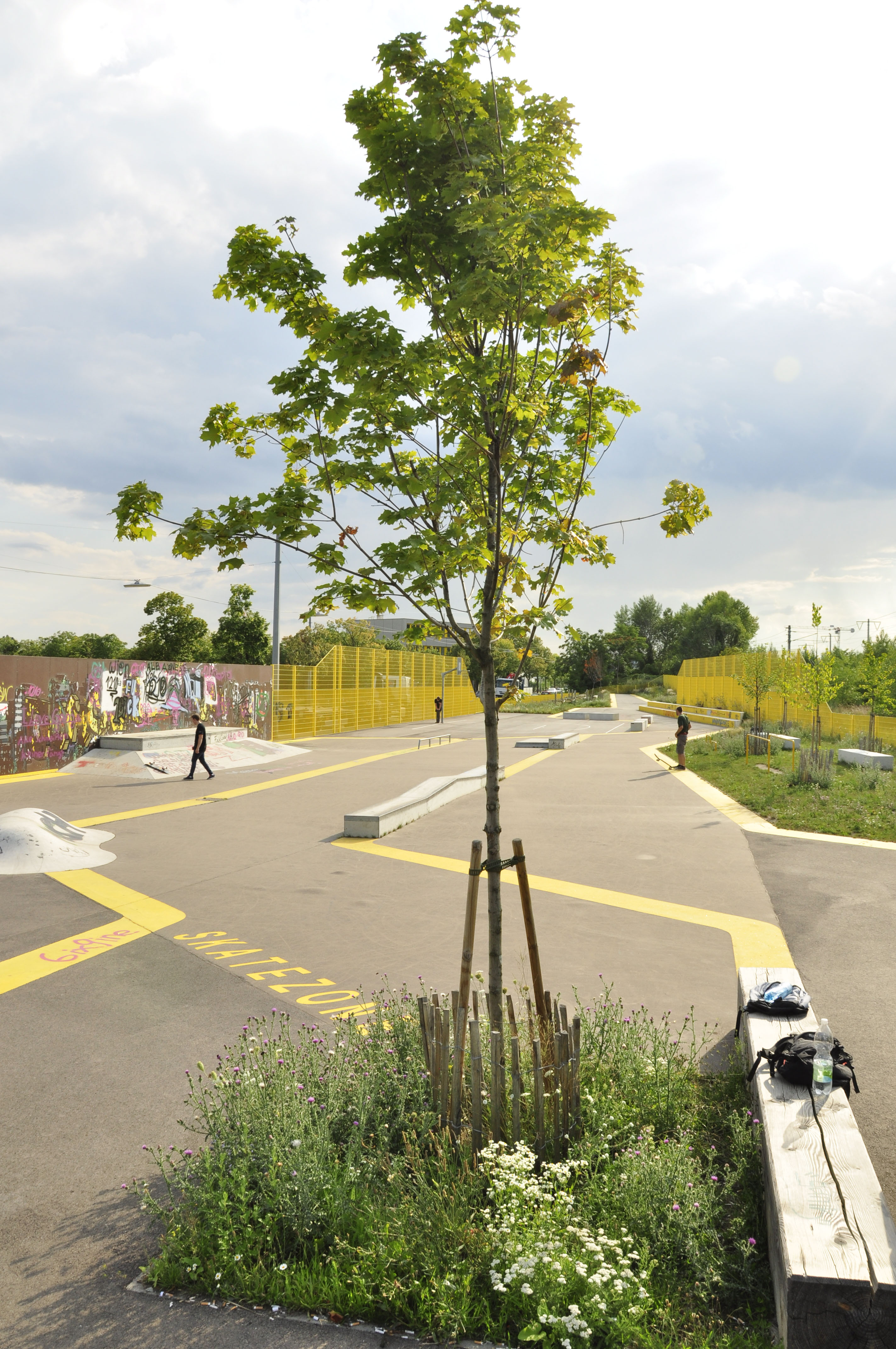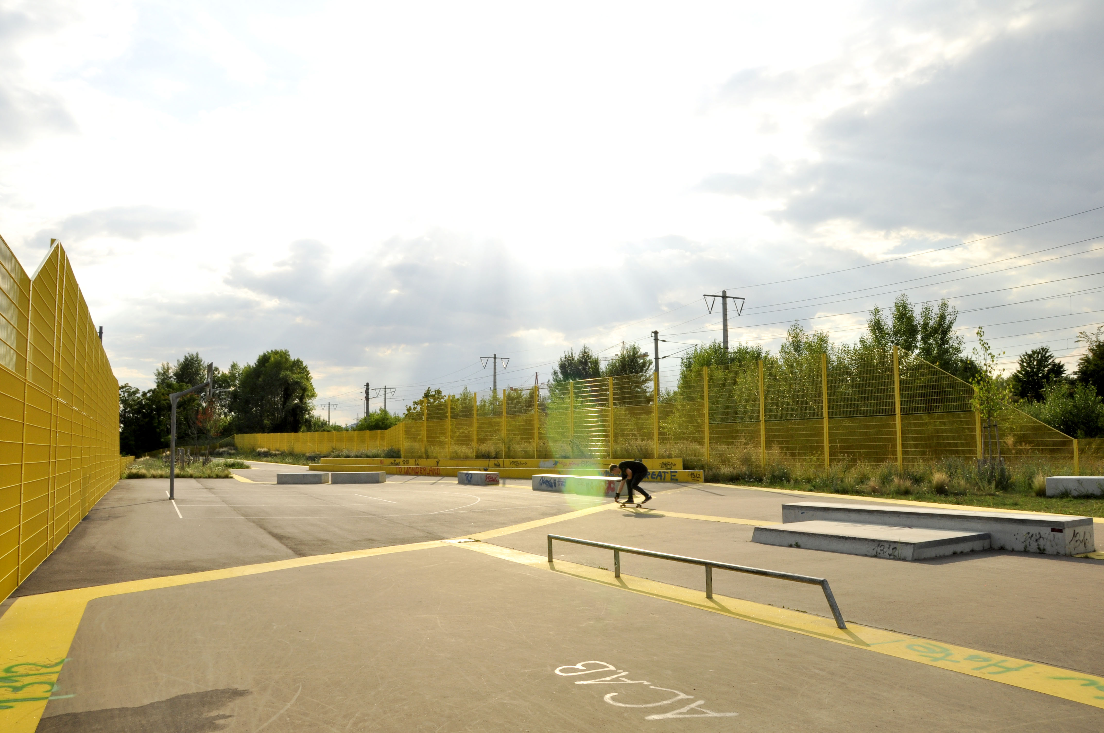 Der Jugendspielplatz Leopoldau entstand an einer klassischen Non-Site zwischen Eisenbahngleisen und den Rändern eines SWW-Areals am Standort eines abgesiedelten Müllsammelplatzes. Ziel der Intervention im Auftrag der MA 48 & MA 49 war es, dem Ort ein neues Gesicht mit neuer Funktion unter Berücksichtigung der Wünsche der Jugendlichen der umliegenden Siedlungen zu geben. Vorhandene Strukturen, wie der Bestandsasphalt und die Entwässerung, sollten integriert und adaptiert werden. Das Konzept konnte trotz engen Kostenrahmens voll umgesetzt werden und sogar die Skaterszene in den Planungsprozess integrieren.