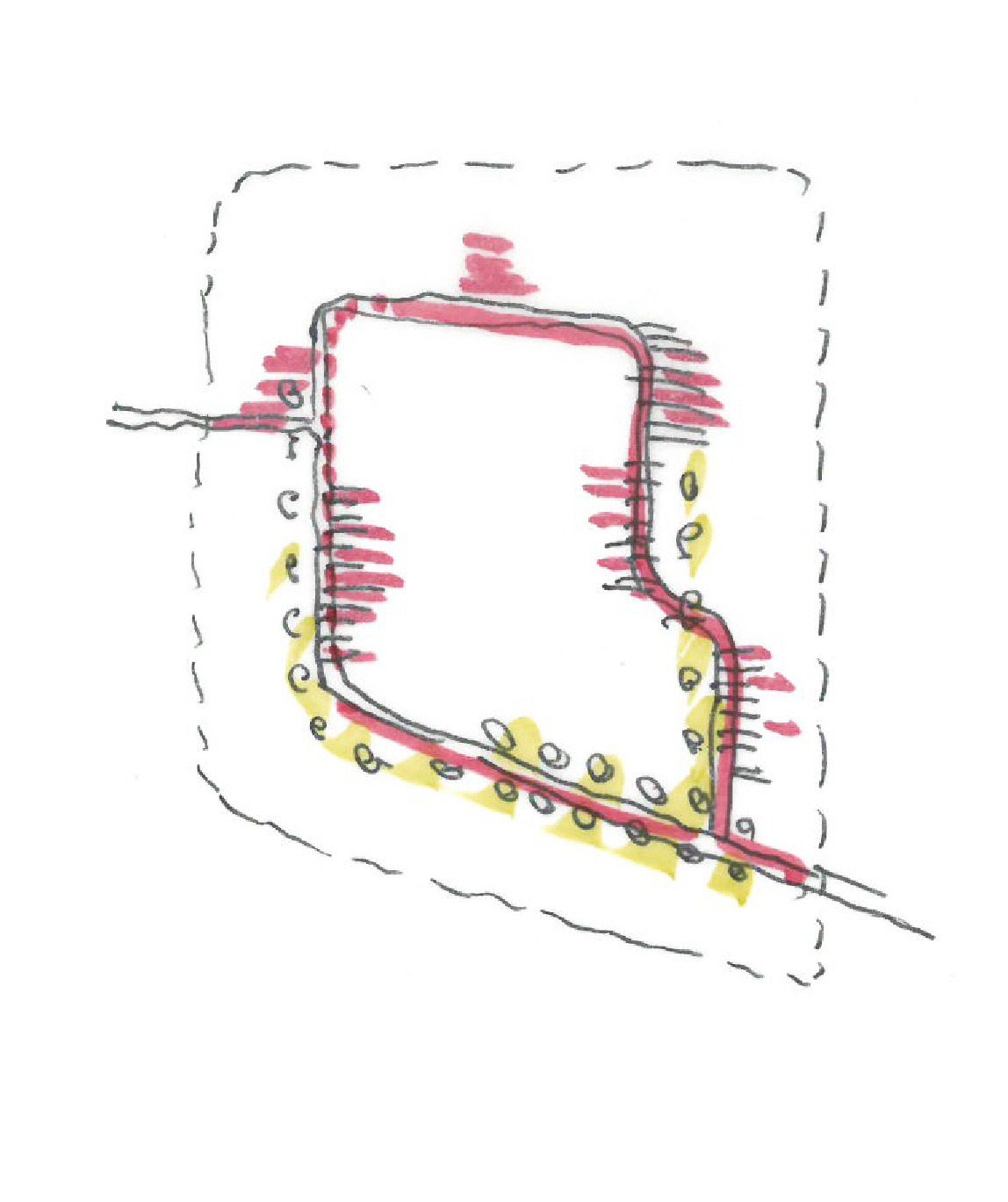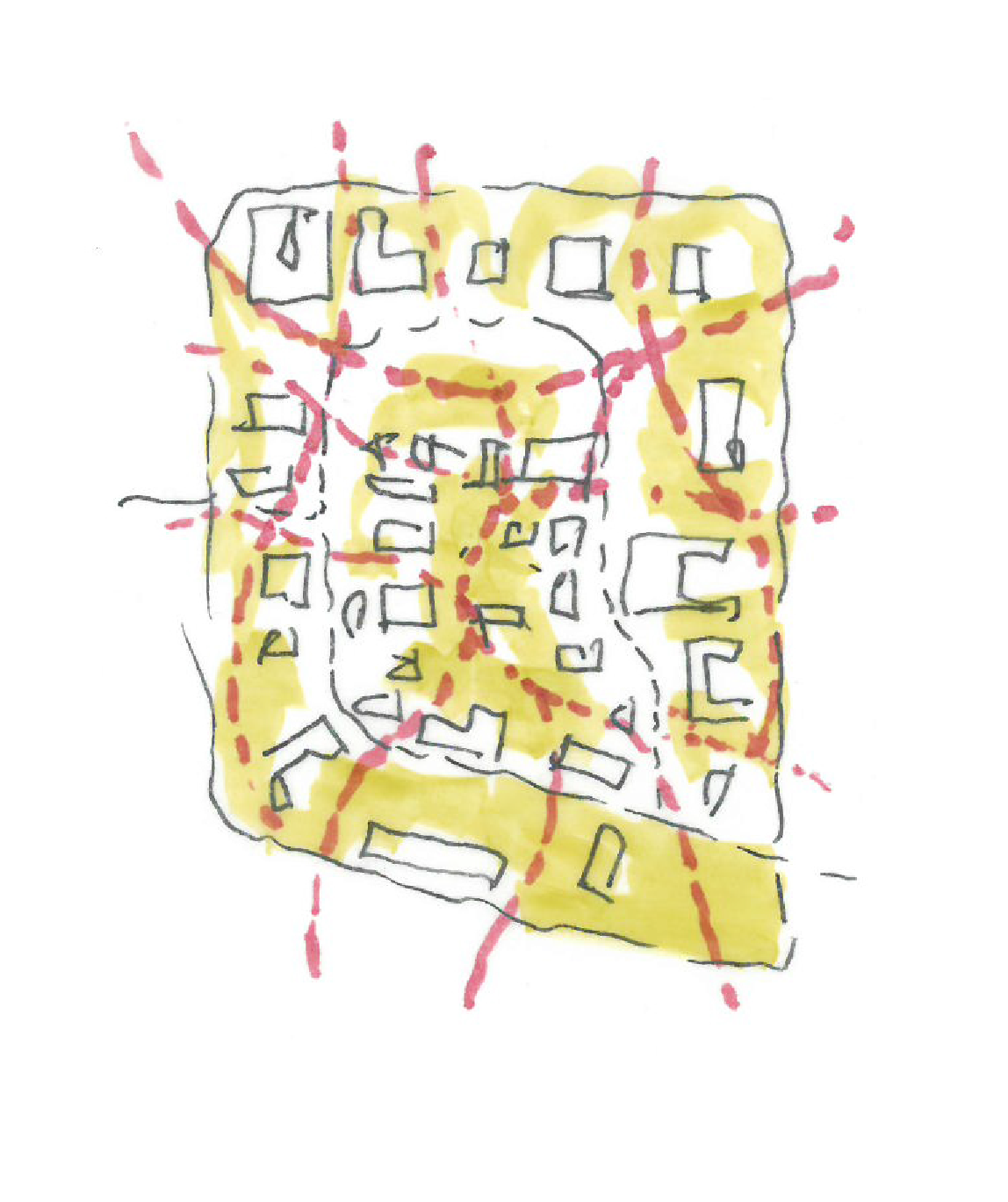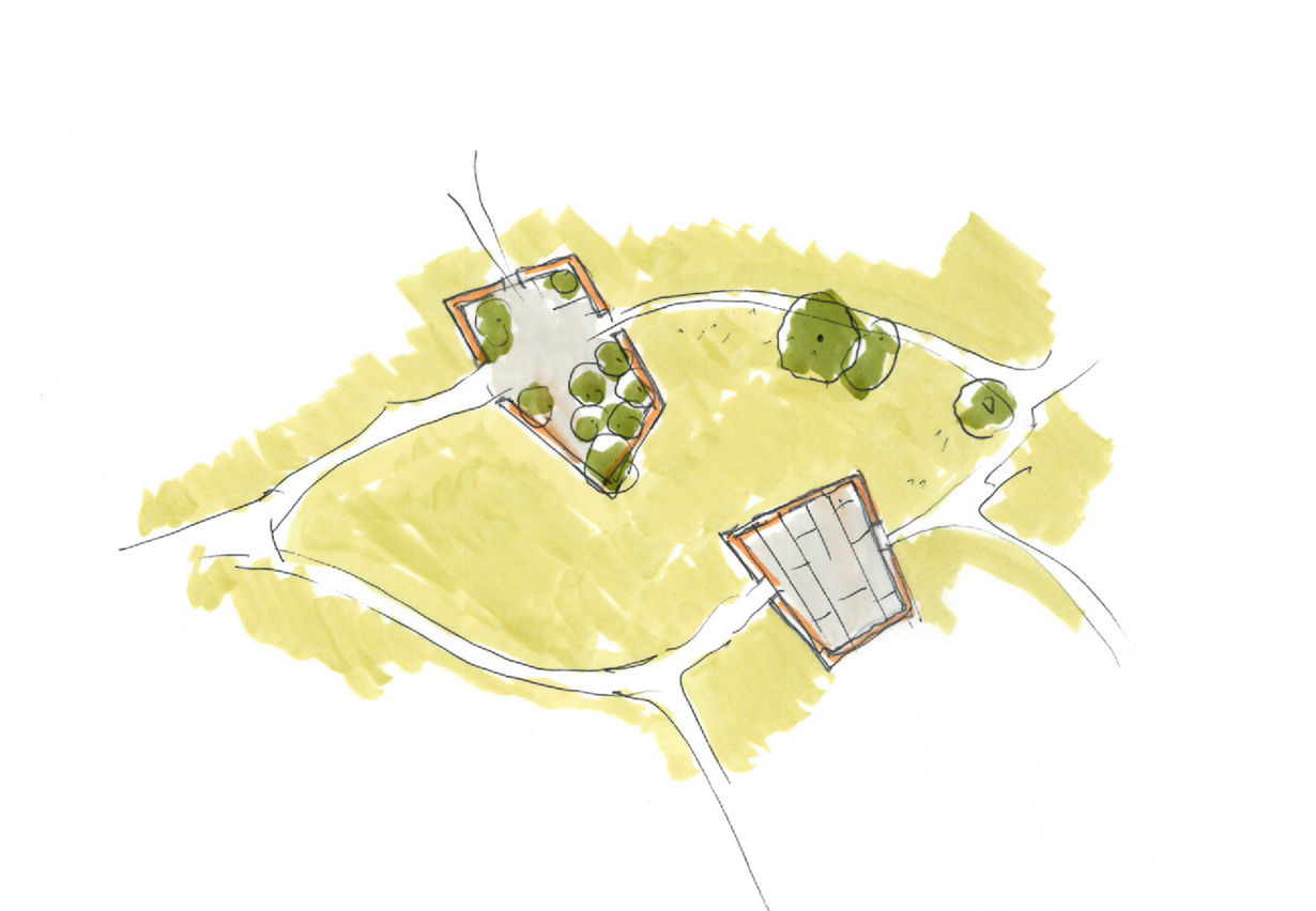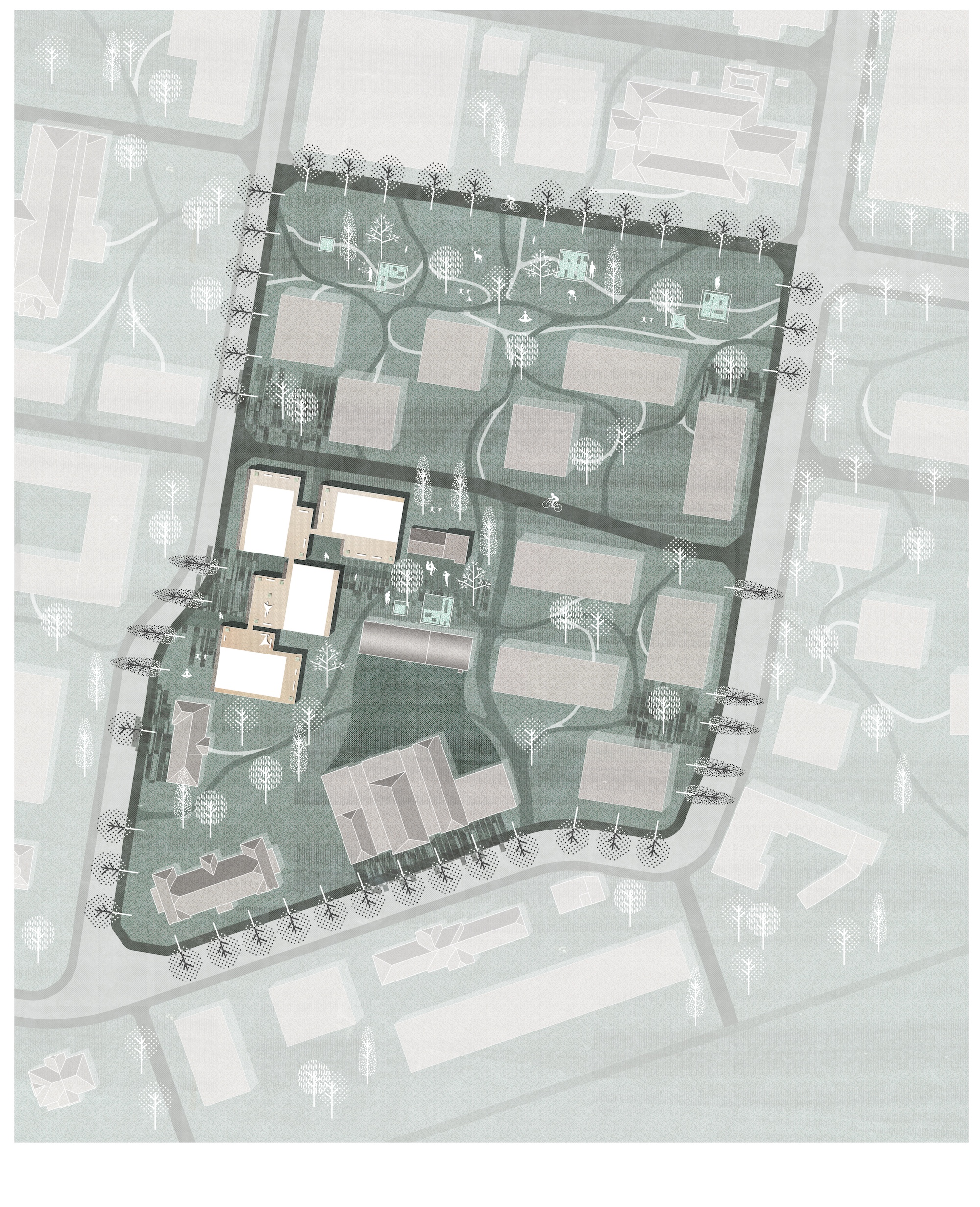 Die Antwort auf die strengen städtebaulichen Rahmenbedingungen (hohe Dichte, kontextuelle Höhenentwicklung und eine kleinteilige Umgebungsstruktur) manifestiert sich in einer differenzierten architektonischen Verwebung von Höhenausgleich, Staffelgeschossen sowie Giebel-, Erker- und Gaupenelementen. So entsteht ein vielschichtiges Gebäudeensemble, das die Maßstäblichkeit der Umgebung aufnimmt und zugleich eine eigenständige Identität entwickelt. Vier versetzt angeordnete, L-förmige Baukörper bilden ein spannungsreiches Gefüge aus Zwischenräumen und Höfen. Diese räumliche Konfiguration ermöglicht mehrfach orientierte Wohnungen mit optimalem Lichteinfall und vielfältigen Blickbeziehungen. Die städtebauliche Qualität der dichten Clusterstellung wird dabei mit der Wohnqualität großzügiger Ausblicke für jede einzelne Einheit verbunden.