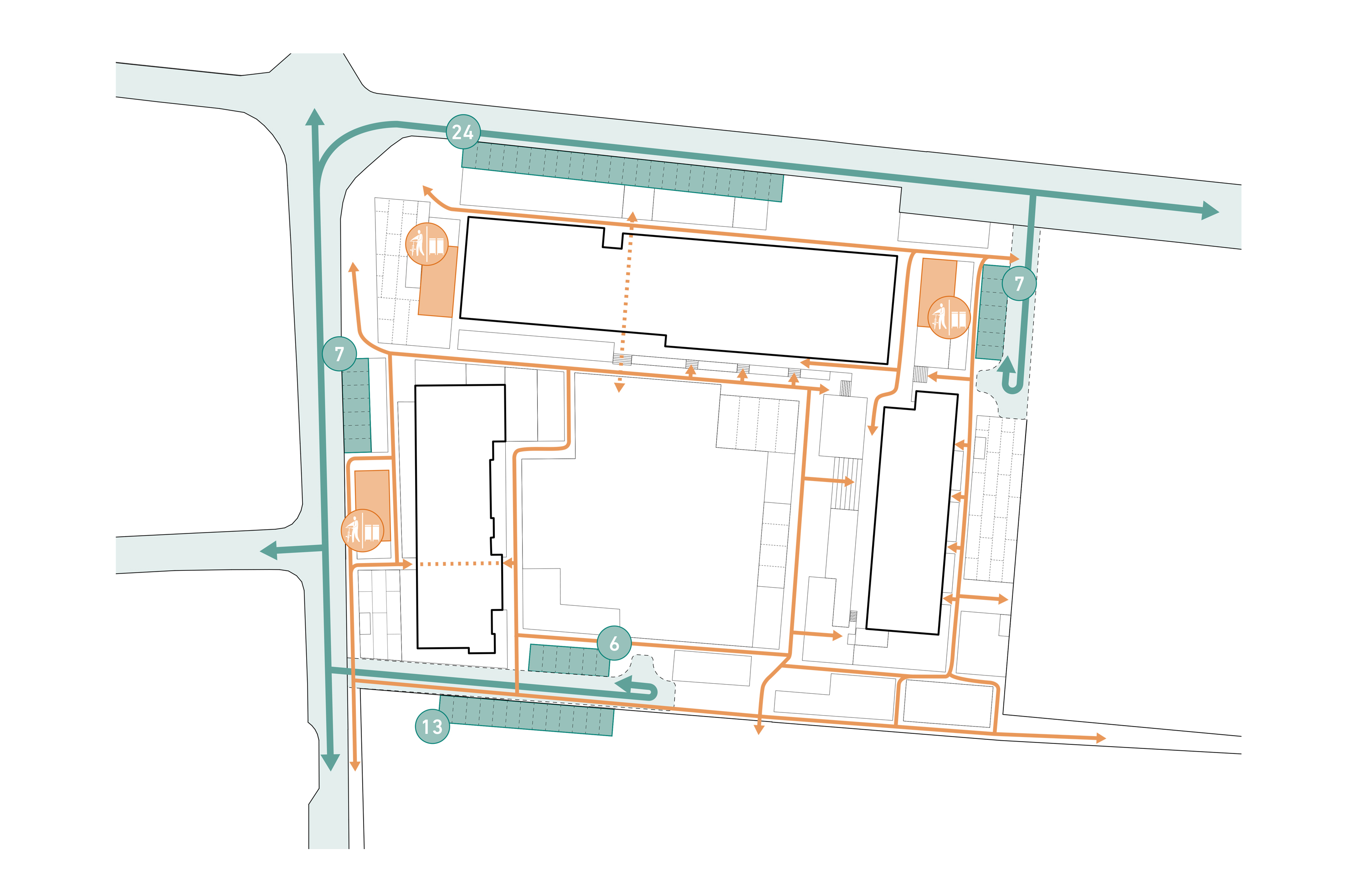 Zur Aktivierung und Verbesserung der Freiraumnutzung werden „Freiraum-Tools“ als multifunktionale Möbel vorgeschlagen. Als wiedererkennbare Elemente versorgen sie den Hof mit einer ortstypischen Gestaltung, die auch für andere Höfe individuell anwendbar sind. Das Ziel ist eine Rückeroberung der Freiräume für die BewohnerInnen des Ossietzky-Hofs. Dank der Anordnung der Stellplätze in den Randzonen lässt sich eine großzügige, freie Mitte mit einem aktiven Rahmen ausbilden. Zusätzlich besteht das Potential, die öffentlichen Freiräume durch eine weitere Reduktion der Straßenflächen zu nutzbaren Räumen in mehreren Schritten zu transformieren. Eine robuste Freiraumstruktur baut ein großes, gemeinsames Feld auf, welches in der Randzone mit vielfältigen Aktionsräumen für alle BewohnerInnen und den angrenzenden Gebäudenutzungen interagiert. Die Kombination aus Freiraum-Tools mit räumlich lesbaren Freiraumfeldern erzeugt wertvolle Räume für Interaktion und Gemeinschaft. Es werden Räume geschaffen, die sowohl zum Austausch mit dem Nachbarn/der Nachbarin einladen, als auch Rückzugsbereiche anbieten. Zur besseren Verzahnung des Ossietzky-Hofes im Stadtgefüge werden die Ecken durch gemeinschaftliche Nutzungen, wie Gemeinschaftsgärten, aktiviert. Auf diese Weise strahlt das Projekt ins umliegende Quartier aus.