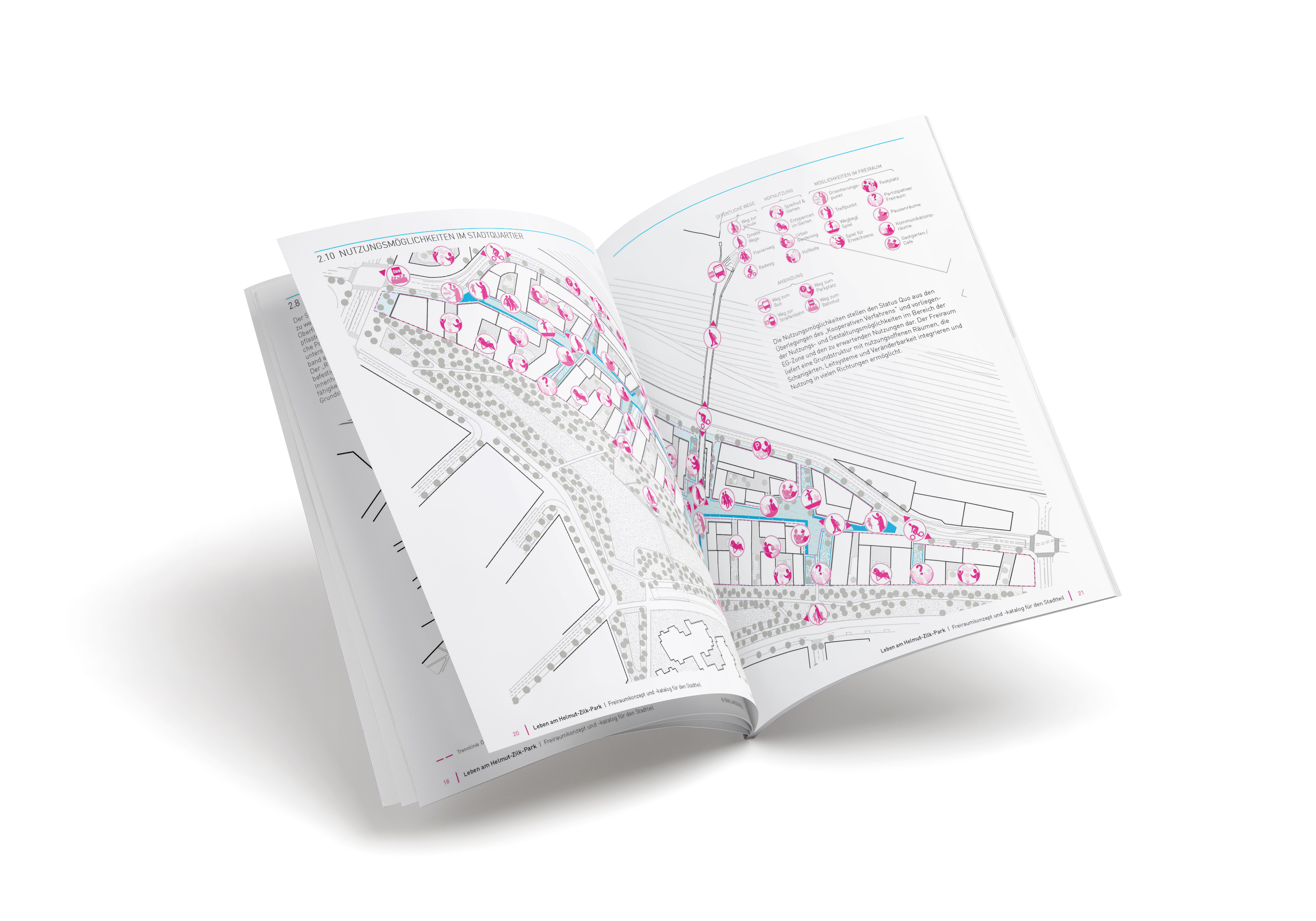 Im Rahmen der Entstehung des neuen Wohnquartiers wurden Strategien des Öffentlichen, die ein Freiraumkonzept für den neuen Stadtteil beinhalten, geschaffen. In Form eines Kataloges wurden die Vision für das Leben am Helmut-Zilk-Park, die Ziele des Freiraumkonzepts, die Materialien, sowie die einzelnen Freiraumtypen dargestellt. Dabei wurden die unterschiedlichen Grade der Öffentlichkeit betrachtet, die einzelnen Funktionen der Teilbereiche abgebildet und Möglichkeitsräume definiert. Somit zeigt der entstandene Katalog die Gestaltungskriterien für sowohl den öffentlichen Raum, als auch für die privaten Freiräume. Diesen Erläuterungen wurde außerdem das Mobilitätskonzept beigelegt. Zur Sicherung der gewünschten Qualitäten des Freiraums wurde das Dokument Teil jedes Grundstückskaufvertrages.