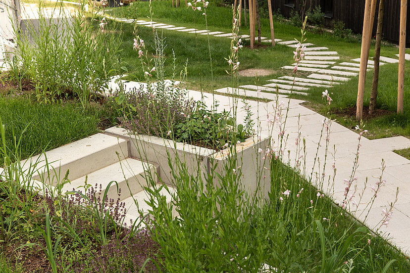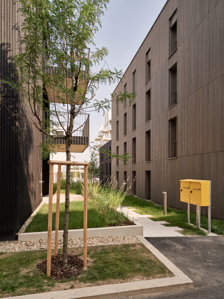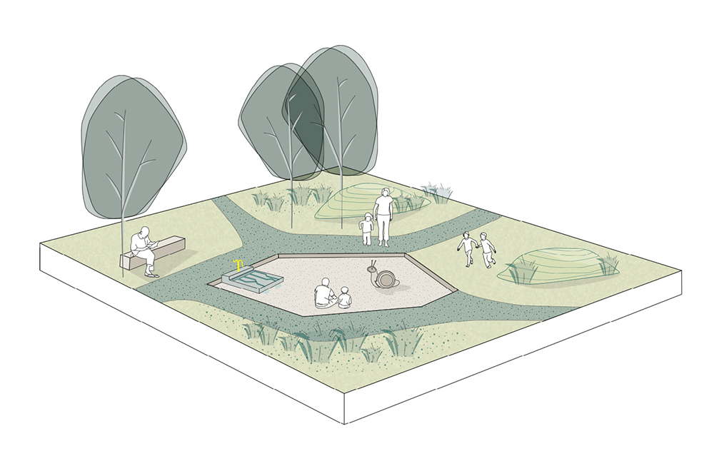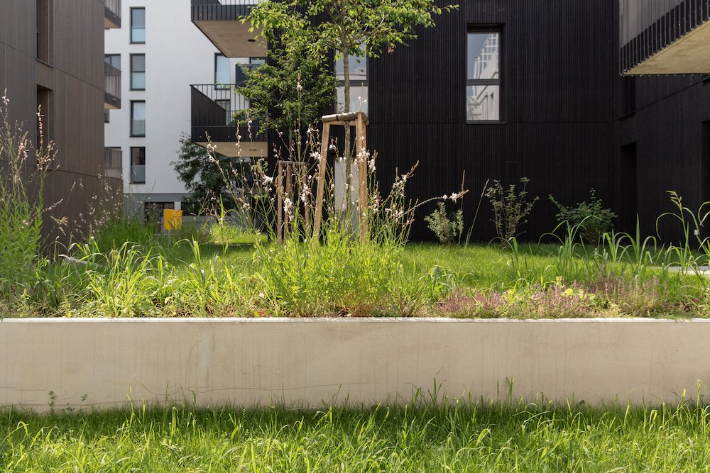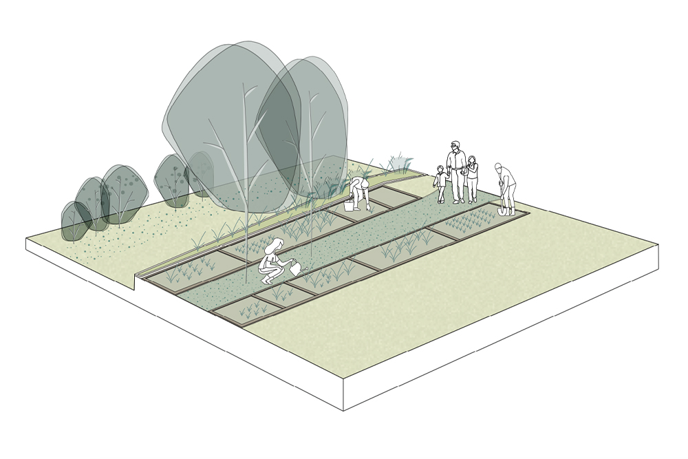 In dem Entwurf für die Bauplätze 11 und 20 wird der Garten als privater und halböffentlicher Raum zur Erweiterung des häuslichen Lebensraums. Die Freiräume stellen einen elementaren Baustein des Gesamtkonzeptes dar. Sie bilden Gemeinschaft, organisieren den Raum und sorgen sowohl für eine baufeldbezogene sowie baufeldübergreifende „Wildgarten“-Identität. Ausgehend von den bestehenden Höhenschichten, sowie deren Anpassung an die neuen Baukörper, wird eine gewellte, freie und an ausgewählten Stellen terrassierte Landschaft geschaffen. Ein ausgreifender Schotterrasen- und Wiesenbereich – eine „wilde Welle“ – bildet die zentrale Allmende aus. Hier docken die barrierefreien Wohnwege vom Straßenraum zu den Gebäuden sowie Orte des gemeinsamen Gärtnerns mit Gartenpfaden, der Kleinkinderspiel- und ein gemeinsamer Platzbereich an. Offene Wiesenflächen und eine Obstwiese zum Franz-Eggermaier-Weg ergänzen das Freiraumangebot. Die privaten Gartenräume schließen direkt an die Terrassen der Gebäude an. Sie werden mit einem gemeinsamen Hausgarten für alle Bewohner:innen des Gebäudes, der jeweils durch einen Hausbaum charakterisiert wird, umfangen und verbunden.