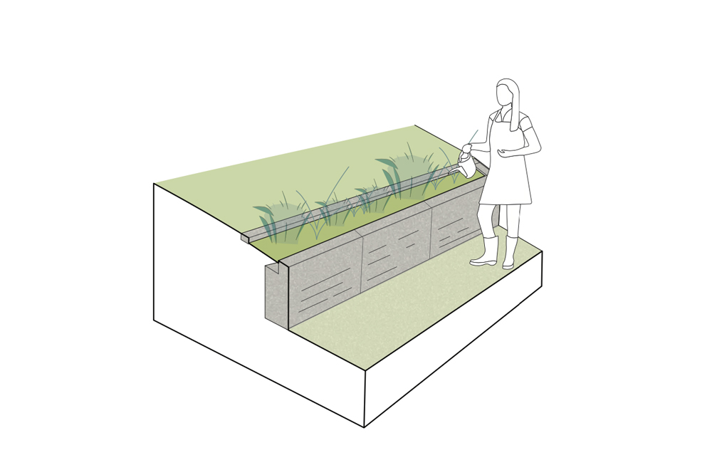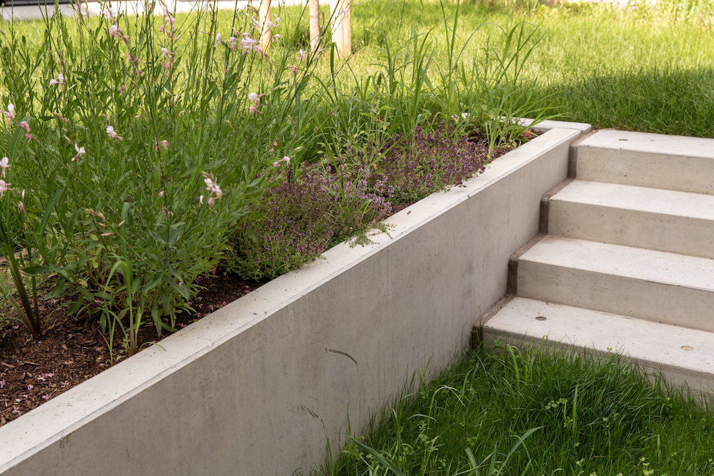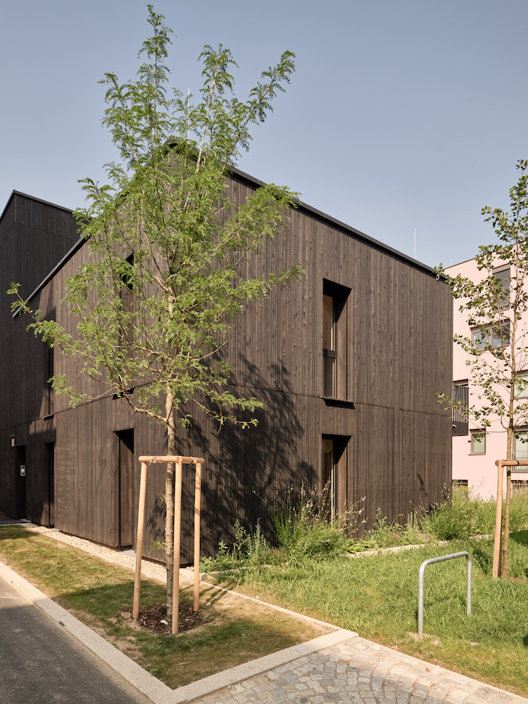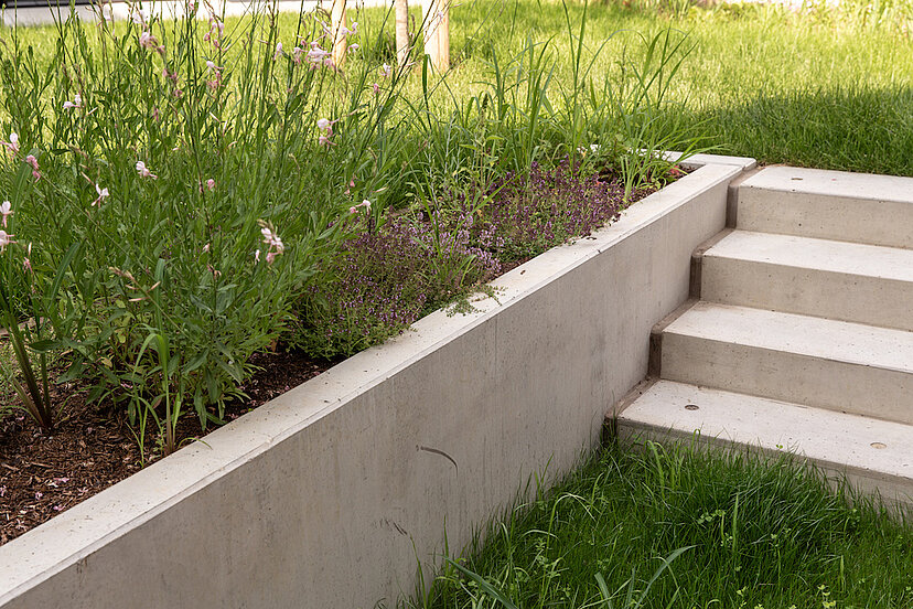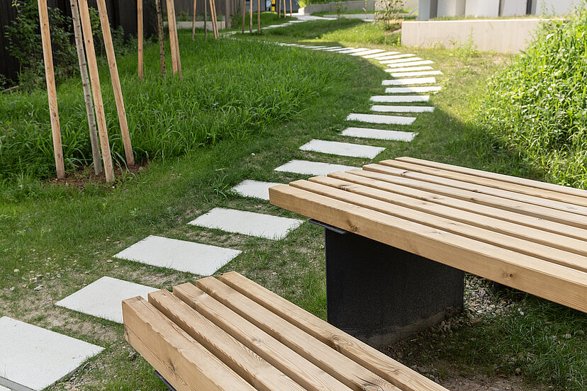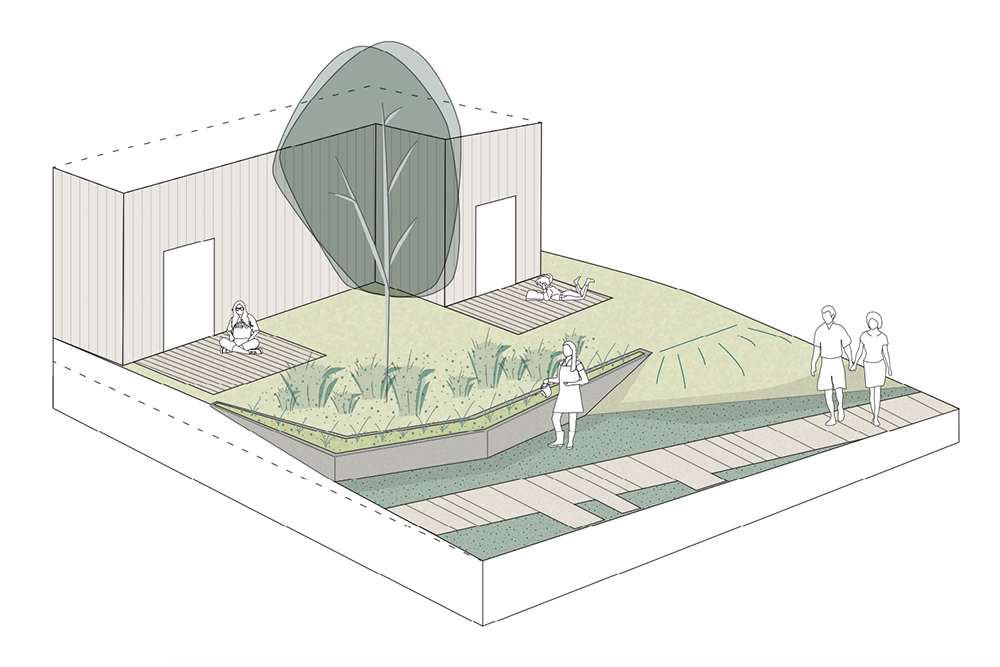 In dem Entwurf für die Bauplätze 11 und 20 wird der Garten als privater und halböffentlicher Raum zur Erweiterung des häuslichen Lebensraums. Die Freiräume stellen einen elementaren Baustein des Gesamtkonzeptes dar. Sie bilden Gemeinschaft, organisieren den Raum und sorgen sowohl für eine baufeldbezogene sowie baufeldübergreifende „Wildgarten“-Identität. Ausgehend von den bestehenden Höhenschichten, sowie deren Anpassung an die neuen Baukörper, wird eine gewellte, freie und an ausgewählten Stellen terrassierte Landschaft geschaffen. Ein ausgreifender Schotterrasen- und Wiesenbereich – eine „wilde Welle“ – bildet die zentrale Allmende aus. Hier docken die barrierefreien Wohnwege vom Straßenraum zu den Gebäuden sowie Orte des gemeinsamen Gärtnerns mit Gartenpfaden, der Kleinkinderspiel- und ein gemeinsamer Platzbereich an. Offene Wiesenflächen und eine Obstwiese zum Franz-Eggermaier-Weg ergänzen das Freiraumangebot. Die privaten Gartenräume schließen direkt an die Terrassen der Gebäude an. Sie werden mit einem gemeinsamen Hausgarten für alle Bewohner:innen des Gebäudes, der jeweils durch einen Hausbaum charakterisiert wird, umfangen und verbunden.