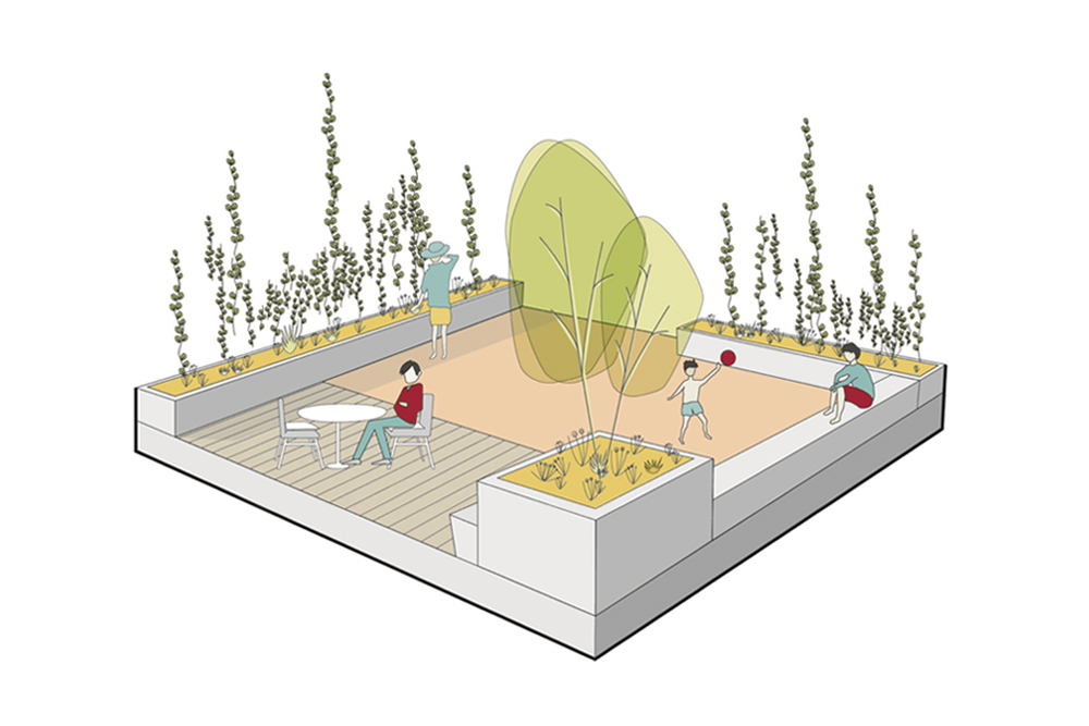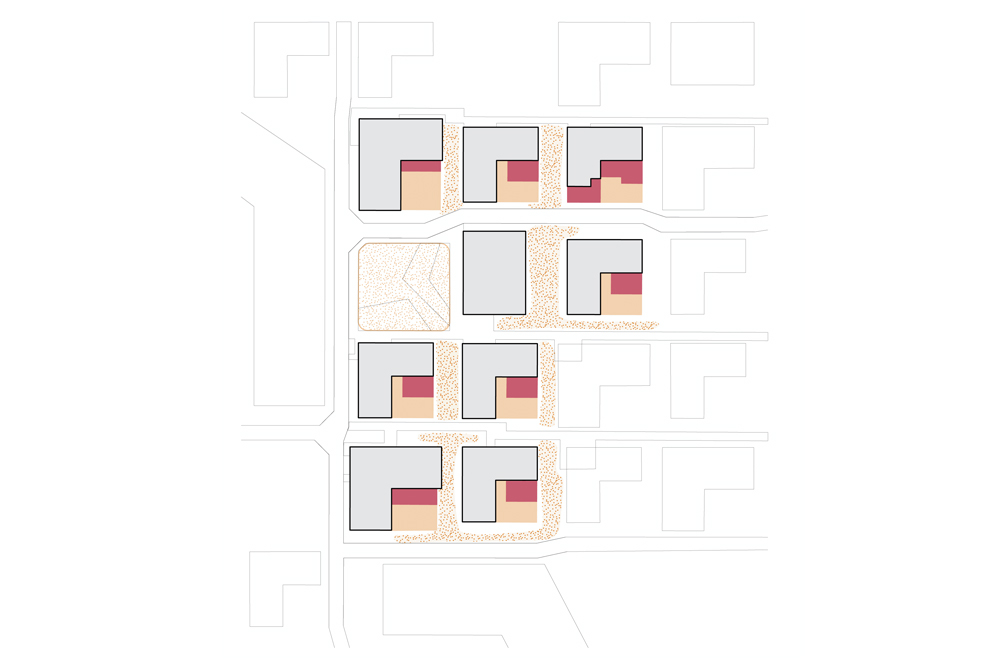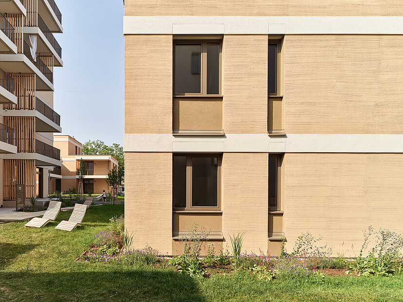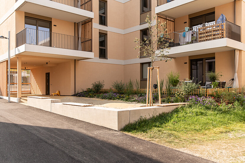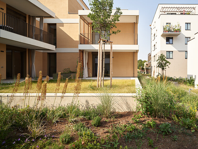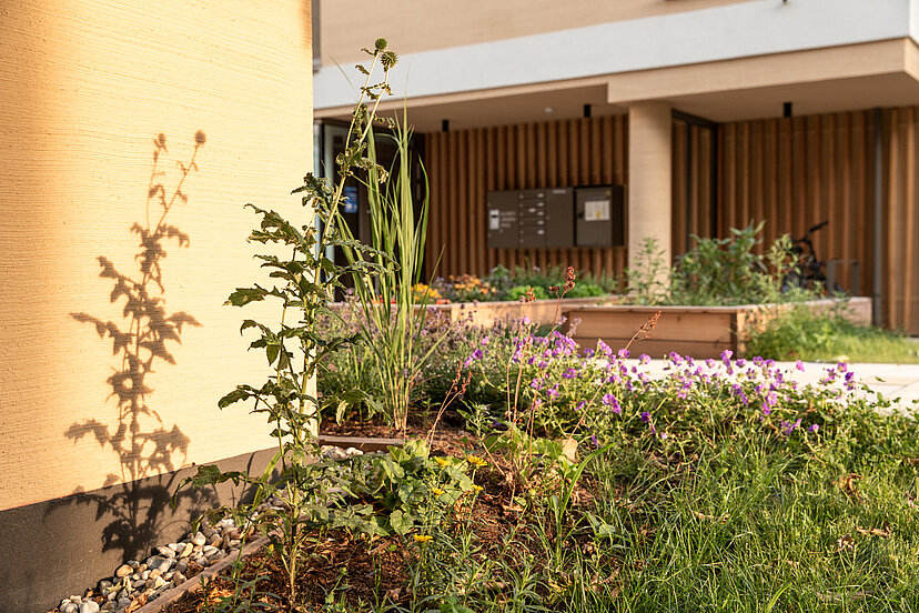 Die auf den gebäudebezogenen Flächen verorteten Privatgärten werden durch Stampfbetonmauern von den halböffentlichen Flächen abgesetzt. Eine variantenreiche Typologie an Freiraumschwellen bietet zusätzliche bauliche und vor allem pflanzliche Tools des sanften Übergangs vom halböffentlichen Gemeinschaftsraum und dem privaten Freiraum. Dies erzeugt einen für den Wildgarten so typischen naturnahen Gesamteindruck, der den Anteil der versiegelten Flächen minimiert und einen Grünraum auf Augenhöhe vorschlägt.