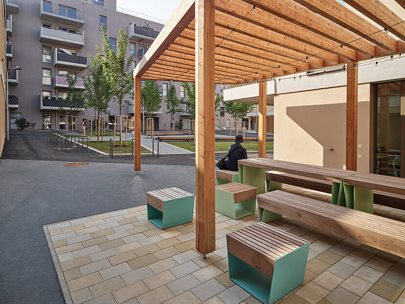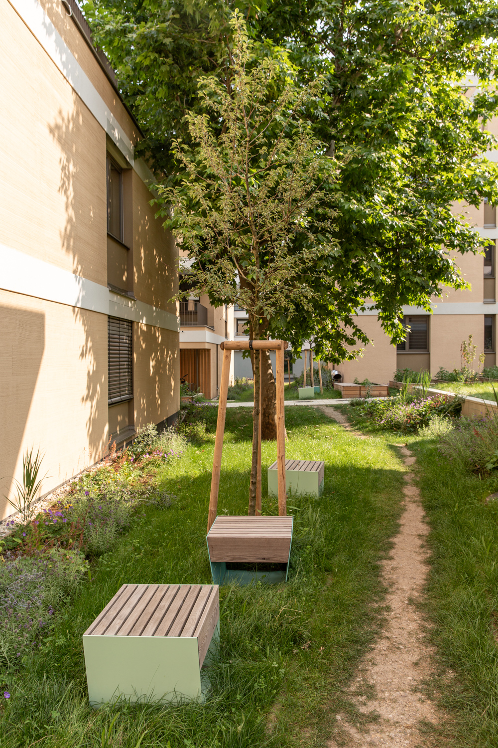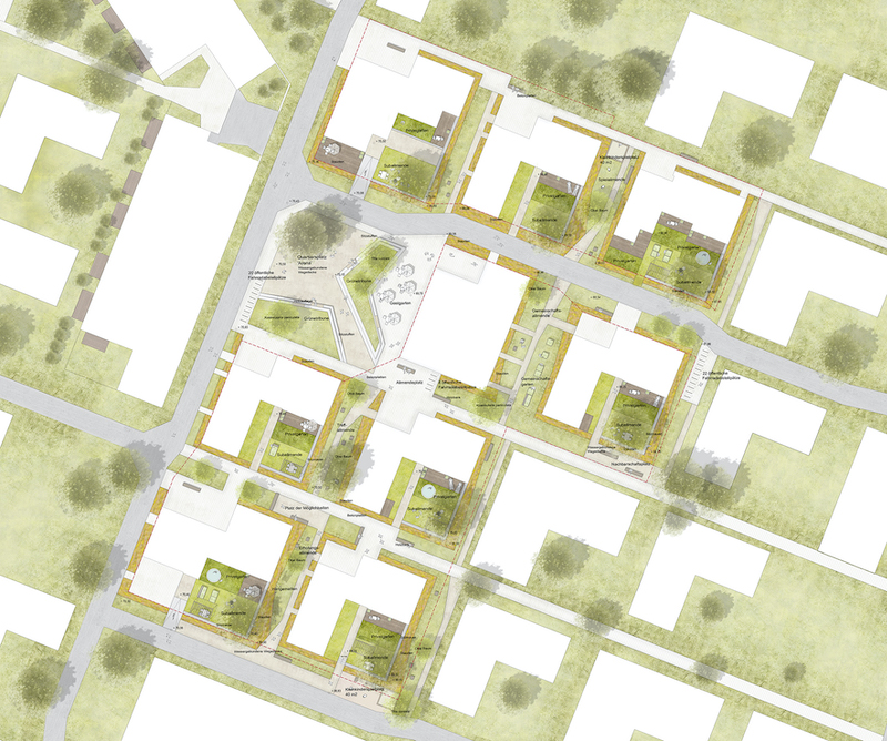 Das gesamte Quartier setzt sich aus verschiedenen Graden der Öffentlichkeit zusammen, die sich gegenseitig ergänzen. Jeder Gebäudetyp, außer der Typ L, verfügt sowohl über Privatgärten, als auch über eine Suballmende, die ausschließlich der Hausgemeinschaft zur Verfügung steht. Hier sind Spielbereiche, Hochbeete und Kommunikationsmöglichkeiten untergebracht. Außerdem wird das Quartier durch eine Allmende miteinander verbunden, in der unterschiedliche Nutzungen eingebettet sind, wie Orte der Erholung, des Aufenthalts, der Kommunikation und des Spiels. Als öffentlicher Platz fungiert der Quartiersplatz. Dieser ist wie eine Arena gestaltet und ist ein Treffpunkt und Veranstaltungsort für das gesamte Quartier. Außerdem befindet sich ein Gastgarten auf dem Platz.