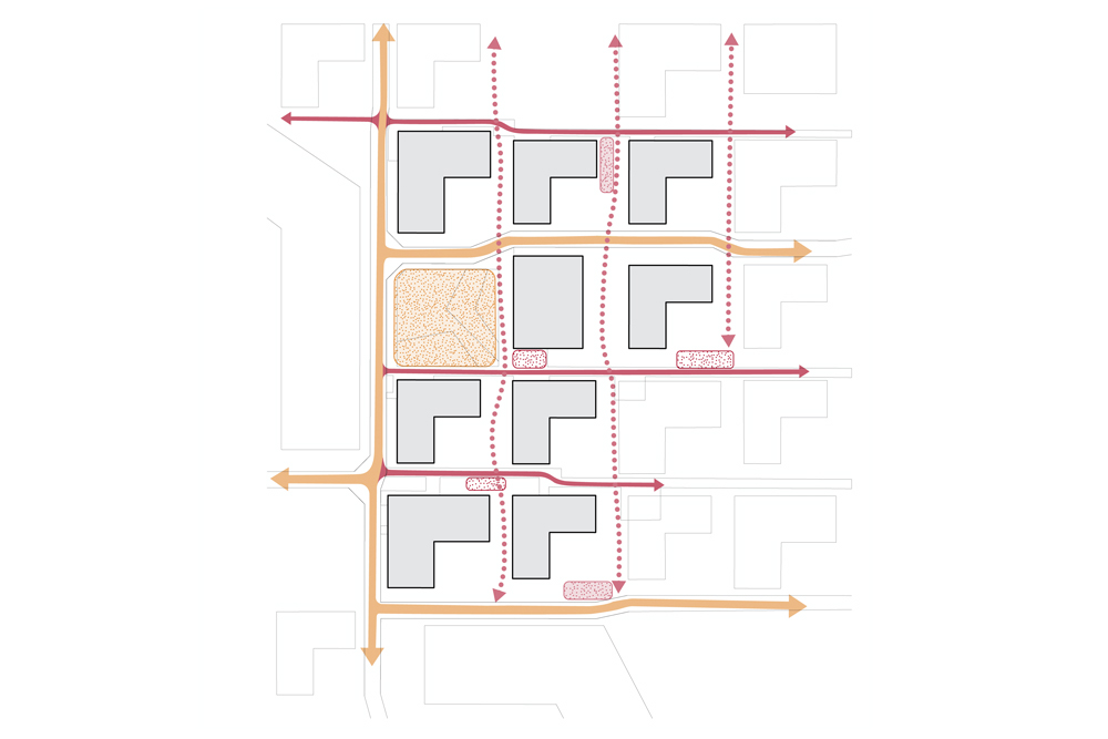 Die Wegeverbindung baut auf die vorhandene Hauptpromenade auf, an der die Erschließung der Gebäude anschließt. Die Querwege schaffen eine Vernetzung mit der Umgebung und ergänzen die bestehenden Verbindungen. Dieses Gerüst wird durch die Allmendewege zusätzlich verstärkt.