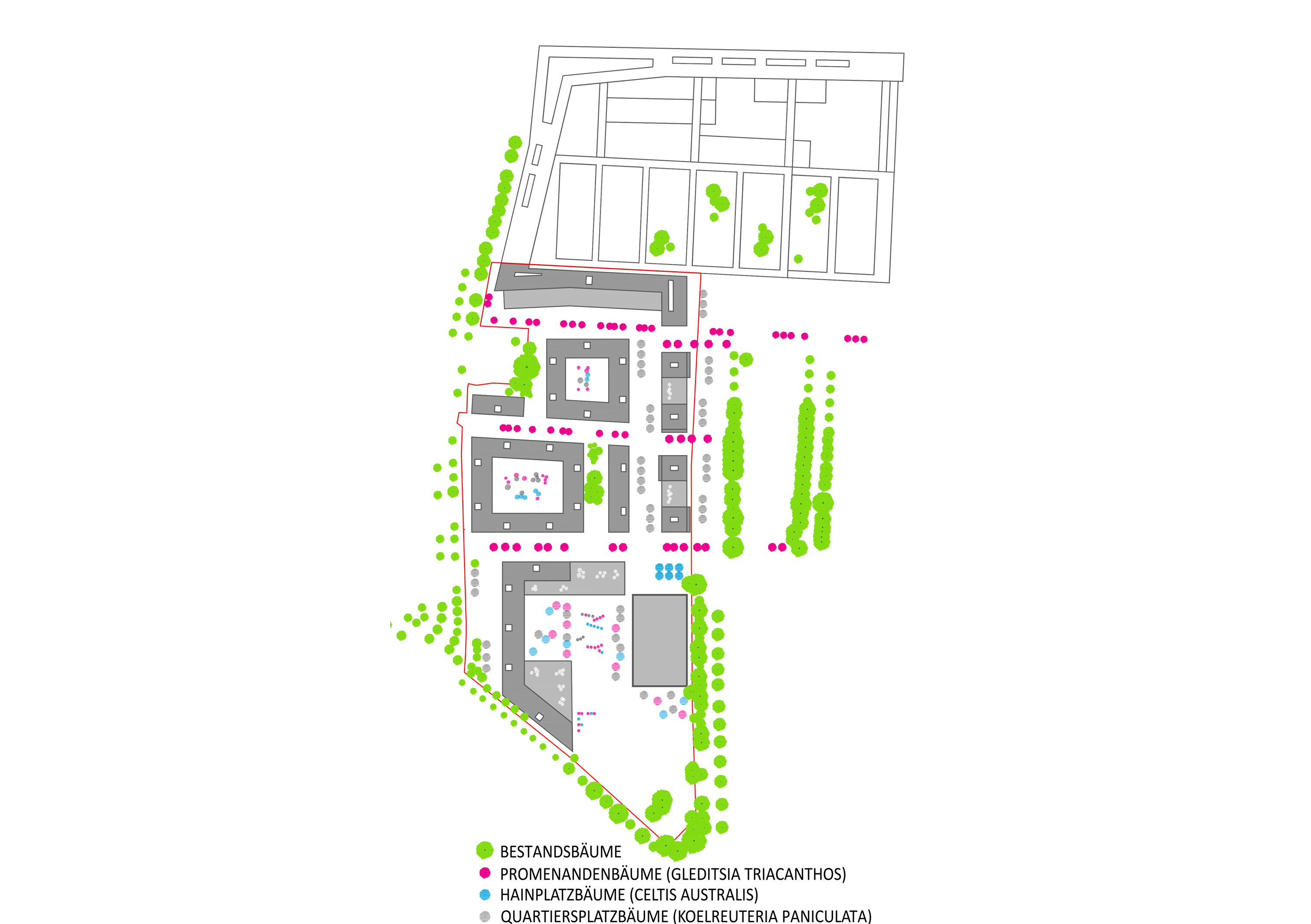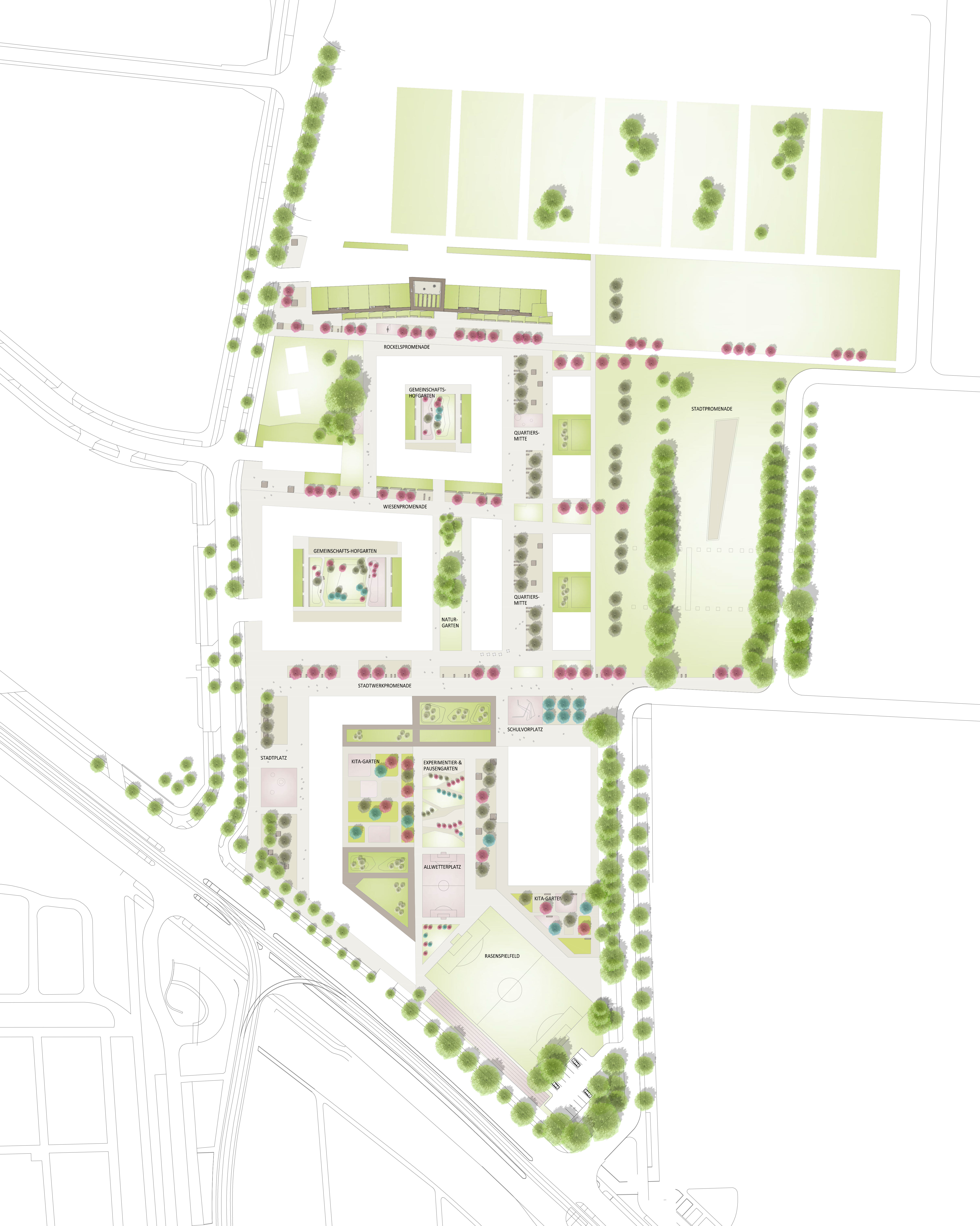 Dabei soll der naturnahe Grünraum, der von der Schwimmbadwiese ausgeht, in das Quartier wirken. Die befestigten Möglichkeits-, sowie die Wiesen- und Staudenfelder und jene Felder, die mit wassergebundener Wegedecke ausgebildet sind, verschränken die gebaute Stadt mit dem naturnahen Freiraum. Dabei spielt der Baumbestand, der erhalten wird, eine wesentliche Rolle. Dieser wird mit ausgewählten Baumarten ergänzt, wodurch ein Element der Orientierung und Wiedererkennung geschaffen wird. Die Neupflanzungen werden geordnet und in Reihen gegliedert.