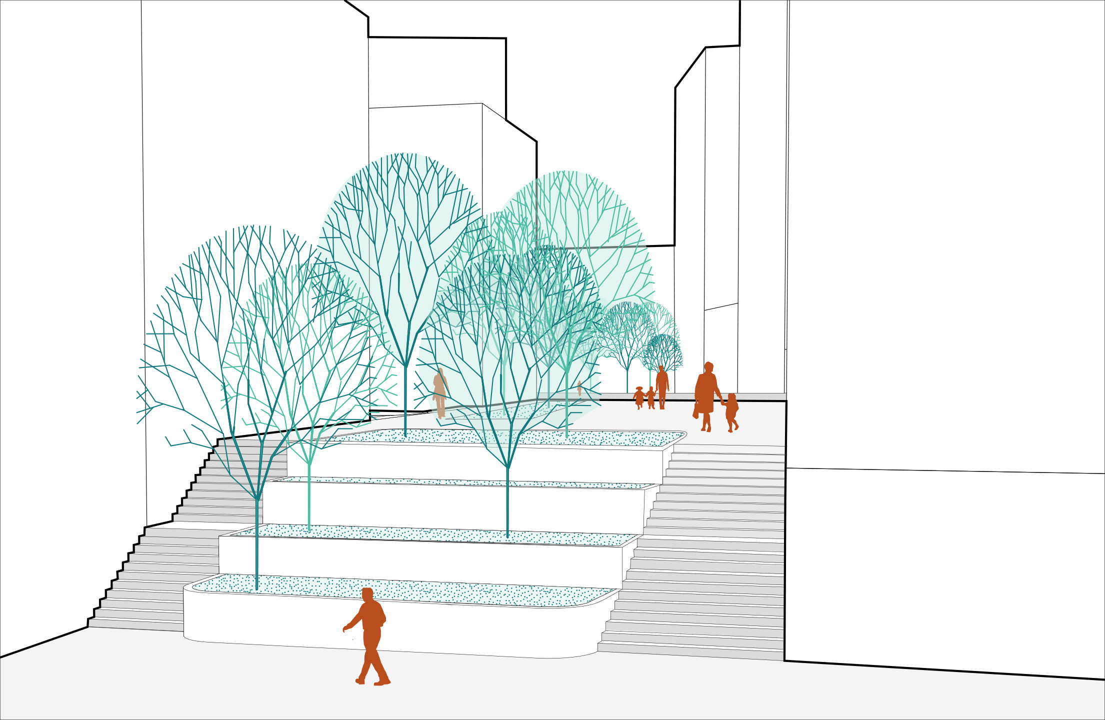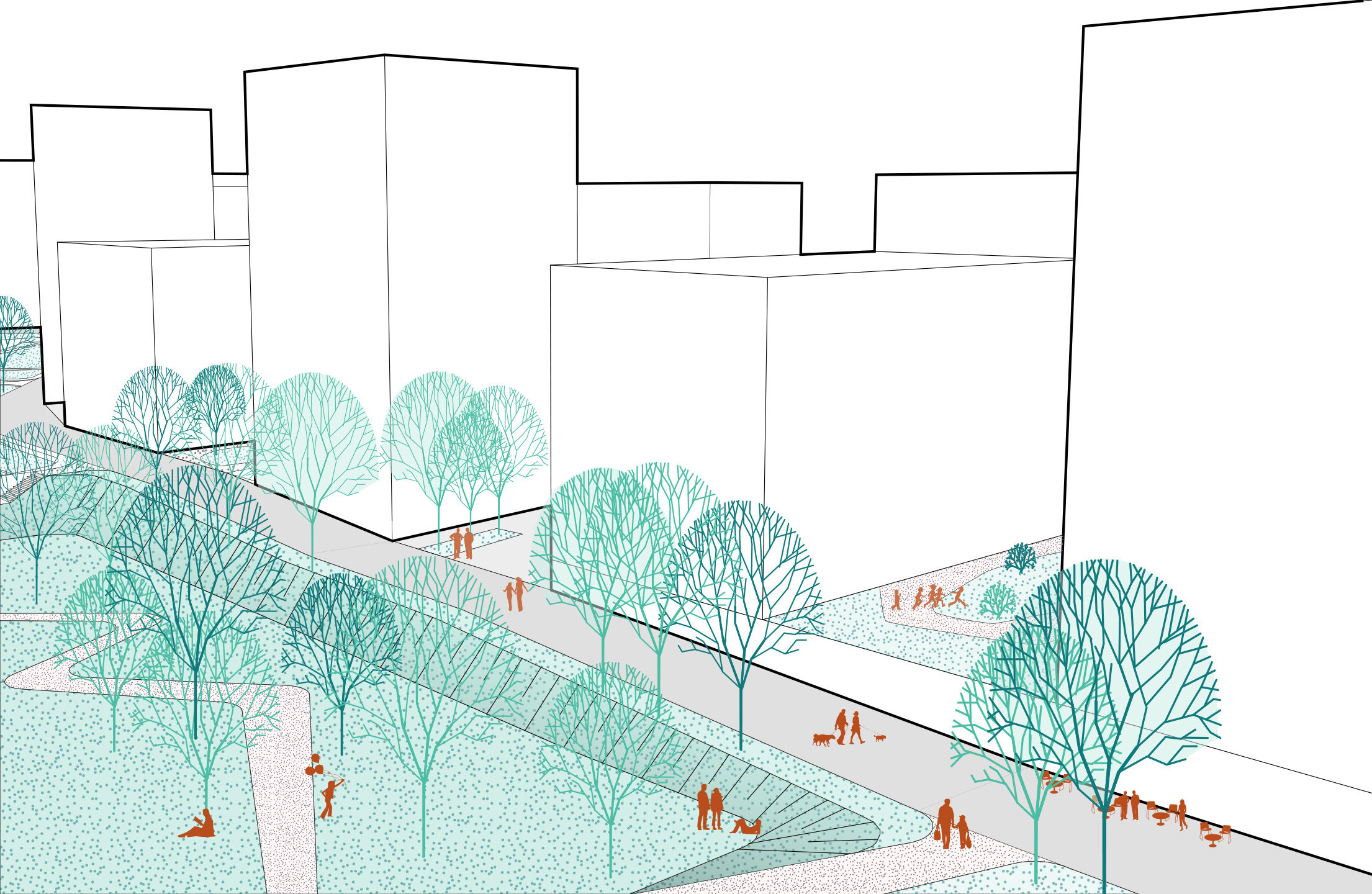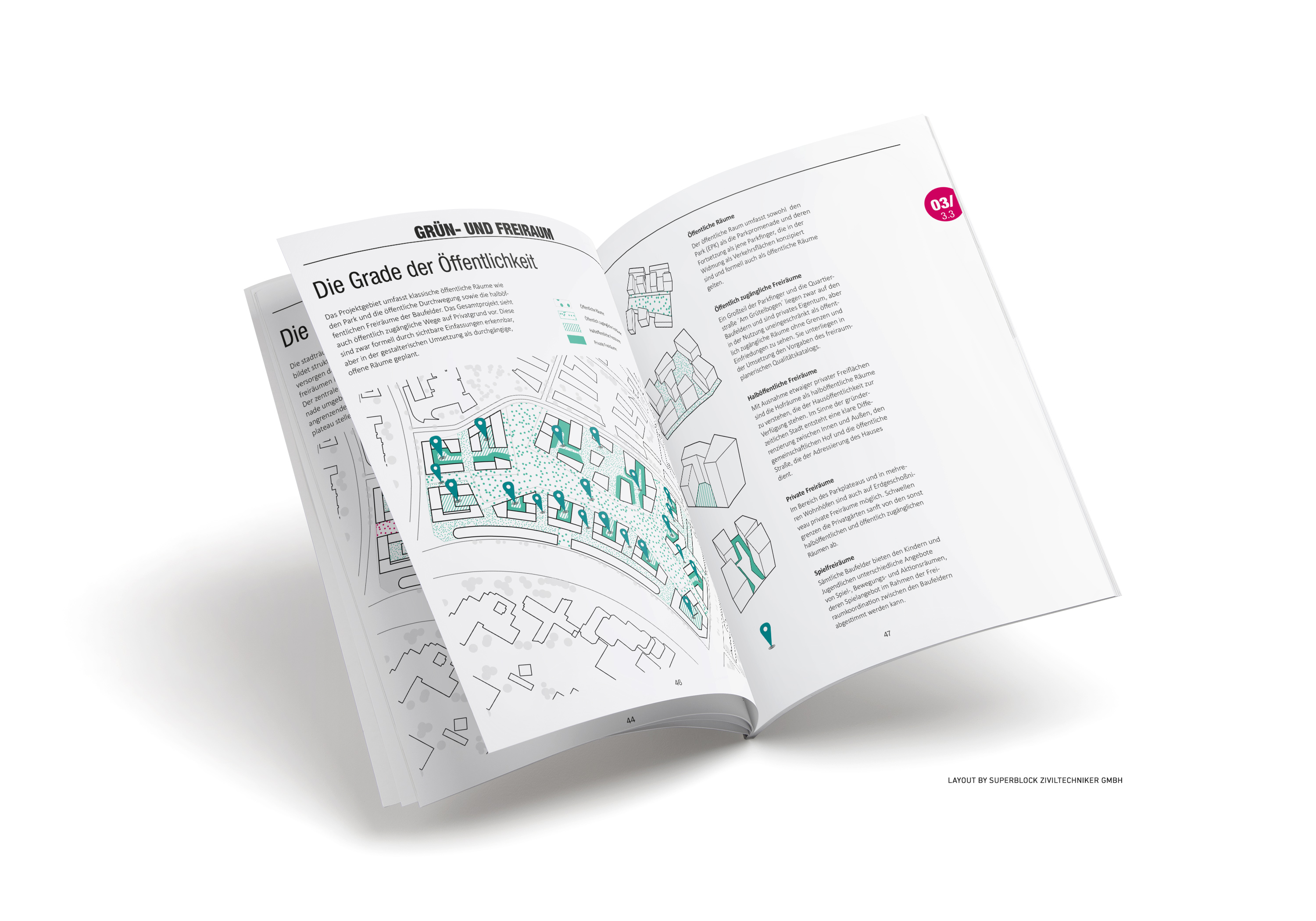 Im Rahmen eines städtebaulichen Gesamtkonzeptes entstand in Kooperation mit SUPERBLOCK Ziviltechniker GmbH ein Planungshandbuch, das sowohl die Ausgangslage des Planungsgebietes, die Zielsetzung, die städtebauliche Leitidee, als auch das Mobilitätskonzept und den Grün- und Freiraum definiert. Vorrangiges Ziel der Niederschrift war die Qualitätssicherung des neuen Wohnquartiers ‘Village im Dritten‘. YEWO LANDSCAPES widmete sich der freiraumplanerischen Thematik und legte das Freiraumkonzept, die dazugehörigen Bausteine, die Nutzung sowie die Grade der Öffentlichkeit fest. Das Herzstück des neuen Wohnviertels soll zukünftig ein zentraler Park, der das Motto ‘Ein Park für Alle‘ trägt, sein. Die gestalterische Kernidee des gesamten Areals sind große Freirauminseln, die qualitative Räume mit Teilqualitäten schaffen. Sie passen sich an die örtlichen Gegebenheiten, wie Höhenunterschiede, den naturräumlichen Bestand, das Wegenetz und die Baufeldkonfiguration an, wodurch der Park einen vielfältigen und abwechslungsreichen Charakter erhält. Die Parkanlage soll von einer Promenade, die das urbane Erschließungsnetz bildet, umrahmt werden. Die grünen Höfe auf den Baufeldern werden mit verschiedenen Nutzungsarten belebt.