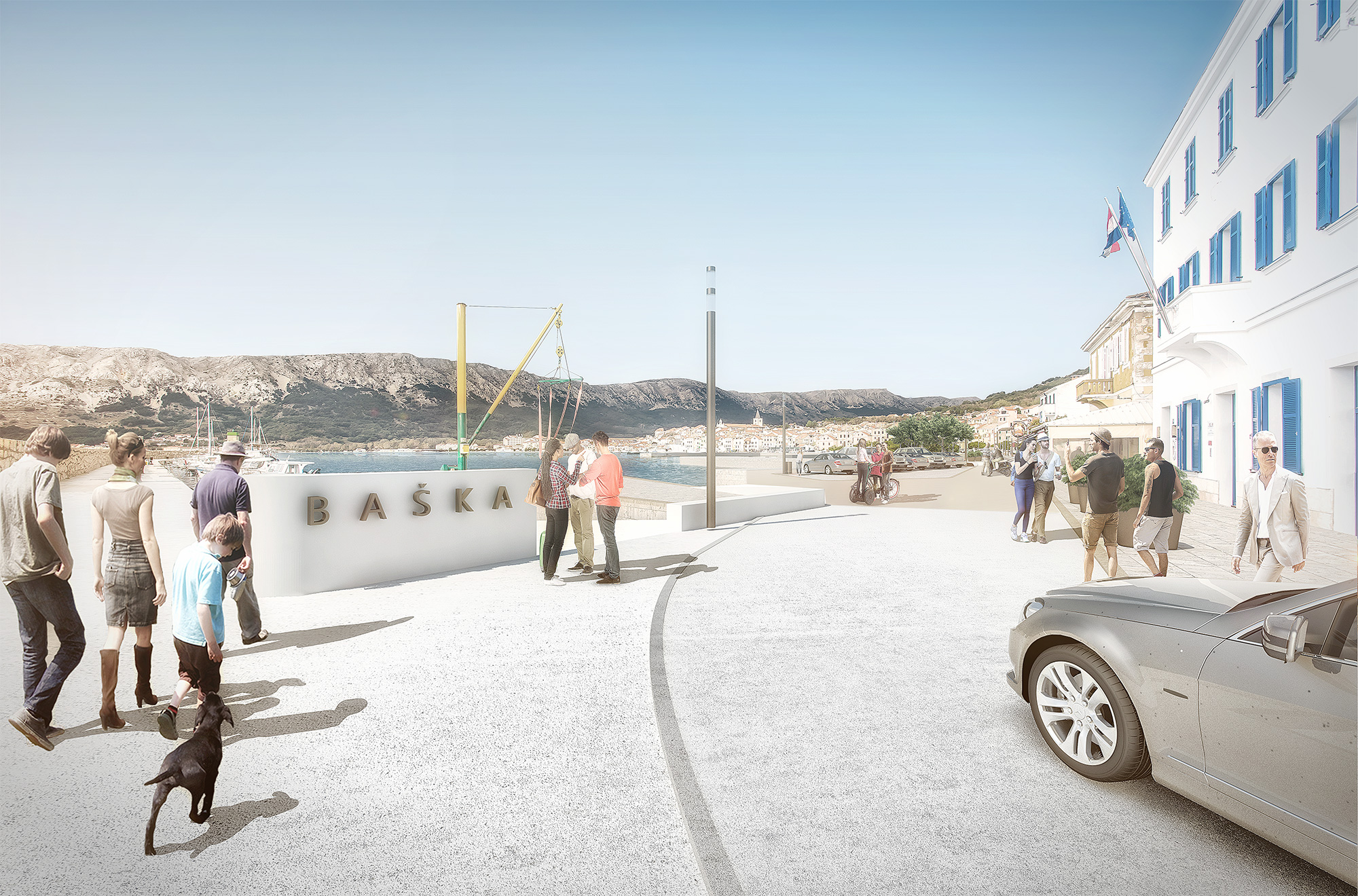 Die Schnittstelle von der weichen Strand- zur urbanen Hafenpromenade bildet einen wichtigen Übergangsraum. An dieser Stelle befindet sich demnach eine perfekte Situation für eine Tribünen-Bühnen-Kombination. Somit entwickelt sich an jenem Ort eine bestehende Mole zu einer festen Bühneninsel mit veränderbarer Bühnenarchitektur. Die räumliche Situation ermöglicht die Einbeziehung des Meeres für Veranstaltungen und in der Nebensaison einen geschützten Strandabschnitt. Als Leitprodukt für die Küstenpromenade von Baška wurde der Kalkstein in unterschiedlichen Formaten ausgewählt. In Kombination mit weißen Betonfertigteilen entsteht eine klare, wiedererkennbare Sprache. Durch unterschiedliche Oberflächenbearbeitungen des Bodenbelags und einem ausgeklügelten Beleuchtungskonzept wird die Promenade in unterschiedliche Zonen gegliedert, sodass sich das Flanieren mit dem Aufenthalt im Freiraum ideal vervollständigt.