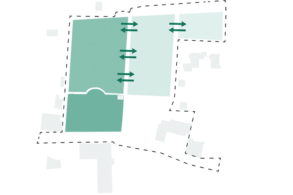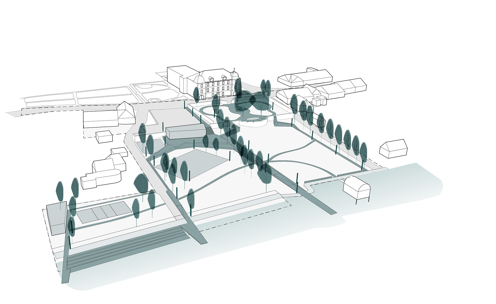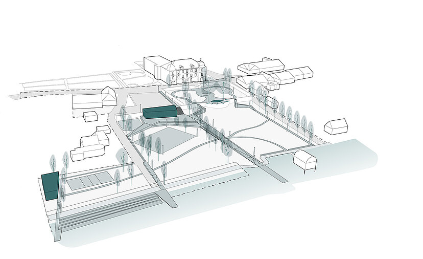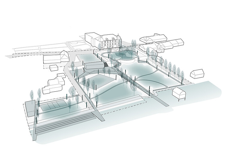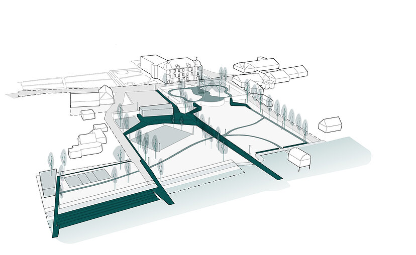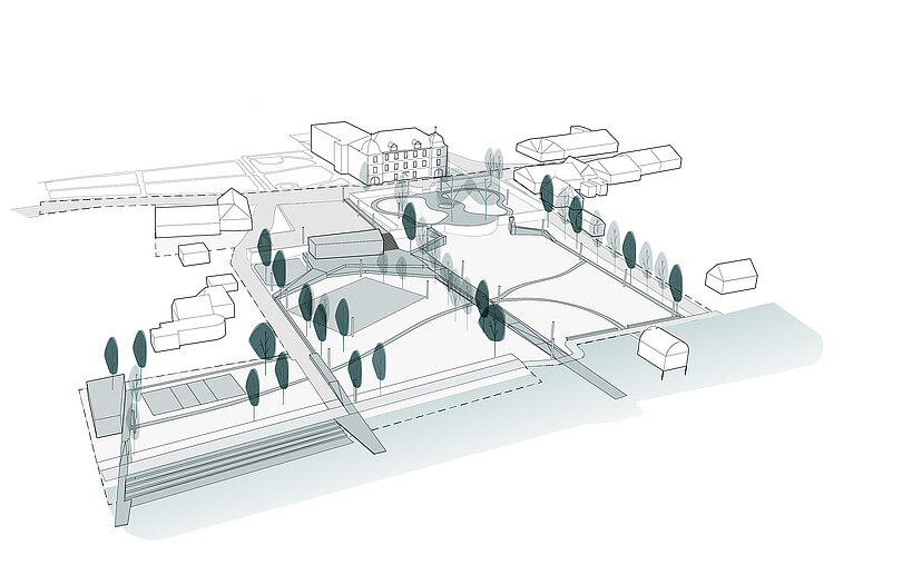 Die barocke Wiese lässt sich in einem Beteiligungsprozess verändern, sozusagen auf die nötigen Anforderungen zurecht schneiden. Die Holzelemente dienen in diesem Sinne auch als Werkzeuge, um sich den Raum unterschiedlich anzueignen. Sie sind mal Steg, mal Bank, mal Pfad. Sie verinnerlichen Restaurant und Umziehkabinen bei der Badi. Bewusste Baumstellungen verstärken den Aspekt beider Seiten, halten aber die räumliche Gesamtkonfiguration zusammen, sie erzeugen Einheit und integrieren historischen Bestand mit den Anforderungen der Gegenwart.