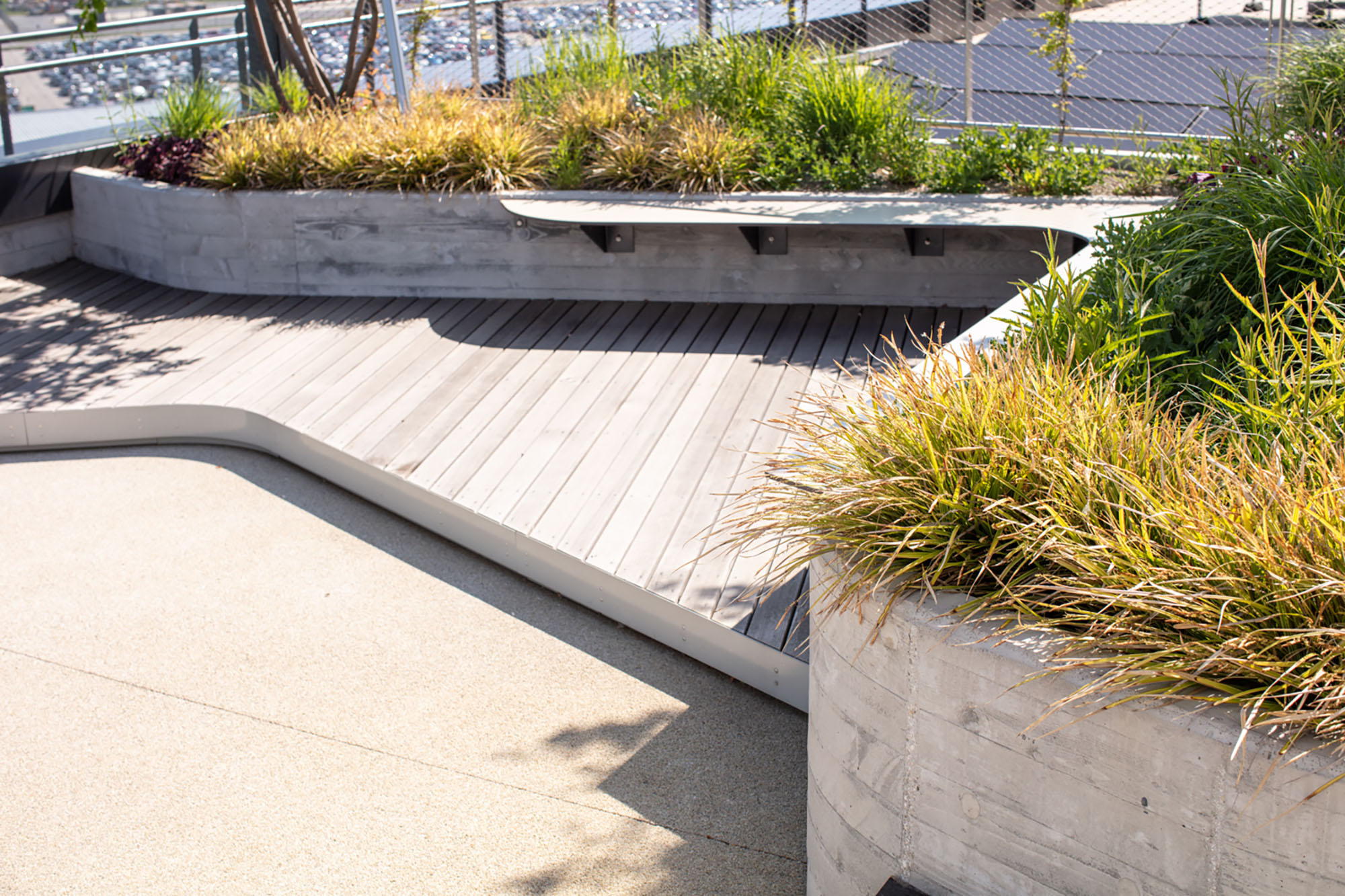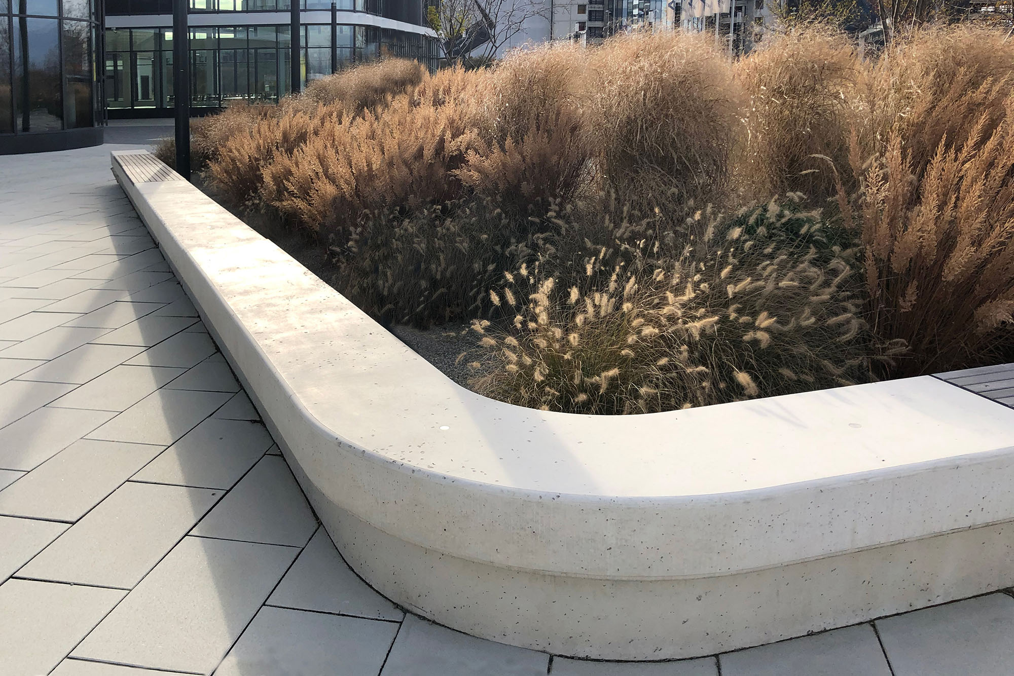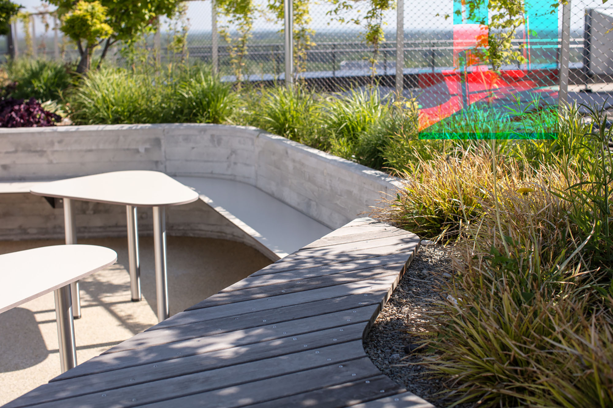 Freiraum und Architektur bilden eine formale wie funktionale Einheit. Freirauminseln umgeben das Gebäude und bilden gemeinsam mit den weichen Gebäudelinien nutzbare Aufenthaltsräume. Der östlich gelegene Hauptplatz bildet das urbane Zentrum der neuen Entwicklung. Er entwickelt sich als Begegnungszone aus den Haupterschließungsachsen des Umfeldes und der benachbarten Baufelder. Eine dichtere Bepflanzung umgibt den zentralen Platz und erzeugt einen räumlichen Rahmen. Die Lage der Bäume und der Grüninseln tragen zur Ausrichtung der Architektur sowie zum Windschutz bei. Grüne Höfe bringen Licht und Natur in den Büroalltag. Angegliedert an den Kindergarten im Erdgeschoss des Bauteils 1 befindet sich ein dazugehöriger Freiraum. Durch die natürliche Gestaltung des Spielplatzes mit Rasen und Sandflächen, der Lage in einer Senke und der dichten Baumpflanzung haben die Kinder die Möglichkeit ein naturnahes Spiel in einem geschützten Umfeld zu erleben. Der Westen des Gebiets steht im Gegensatz zu den urbanen, befestigten Flächen des Hauptplatzes ganz im Zeichen der Natur. Großzügige Wiesenflächen, zahlreiche hochstämmige Laubbäume und ein weitläufiges Wegenetz laden zu Spaziergängen oder zur sportlichen Betätigung ein.