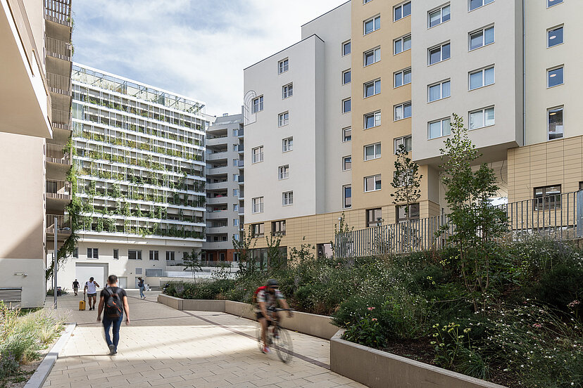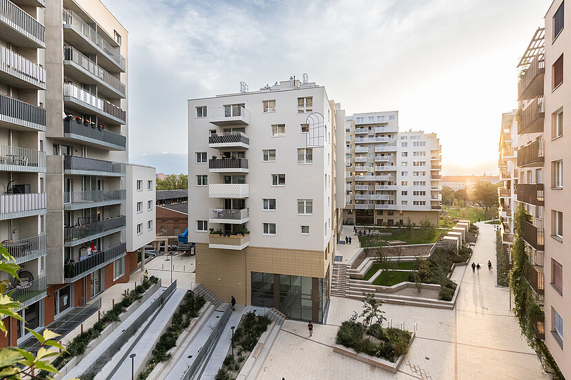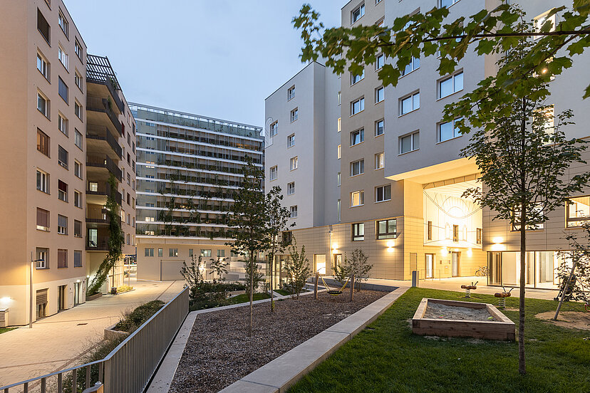 Ein neues, attraktives Grätzel mit vielfältigen Grün- und Freiflächen. Der Kinder- und Jugendspielplatz im terrassierten Hof-Areal der Wohnhausanlage lädt zum Spielen und Bewegen ein, der zentrale Quartiersplatz bietet viel Raum für Erholung und die Freiflächen rund um die ehemalige Remise bieten Möglichkeiten für Kommunikation und Vernetzung. Die Grünfassade selbst dient nicht nur als Blickfang, sondern ist vielmehr eine ökologische Antwort zum Thema Klimaanpassung, denn vertikales Grün kühlt, verschattet und filtert zusätzlich Staub.