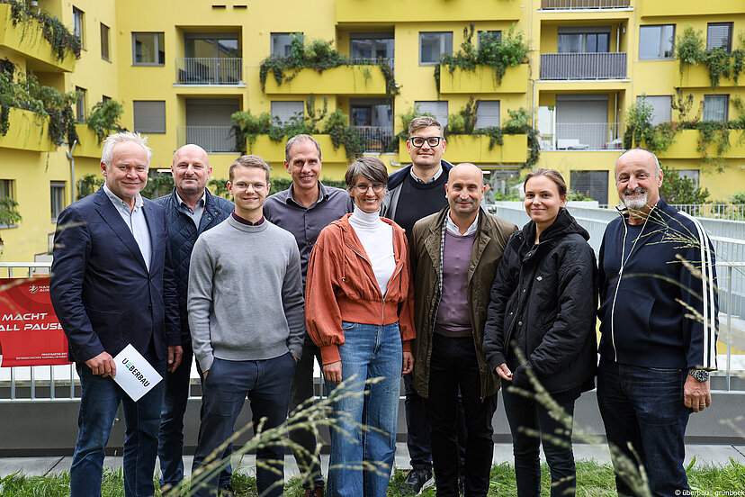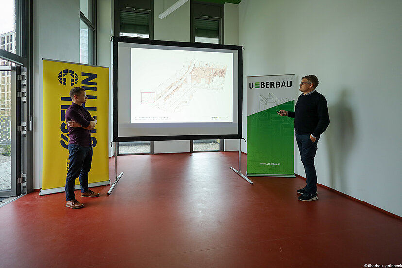 Im Rahmen der Präsentation stellten Leo Lavalade, Projektverantwortlicher bei YEWO, und Dominik Scheuch, Geschäftsführer von YEWO LANDSCAPES, Details zur Freiraumgestaltung vor. Neben ihnen präsentierten weitere Projektbeteiligte, darunter Vertreter:innen der MIGRA und WOGEM als Bauträger, dem Architekturbüro querkraft und dem Bauunternehmen ÖSTU-STETTIN, die den Gästen Einblicke in die Planung und Umsetzung des Freiraumprojekts gaben.