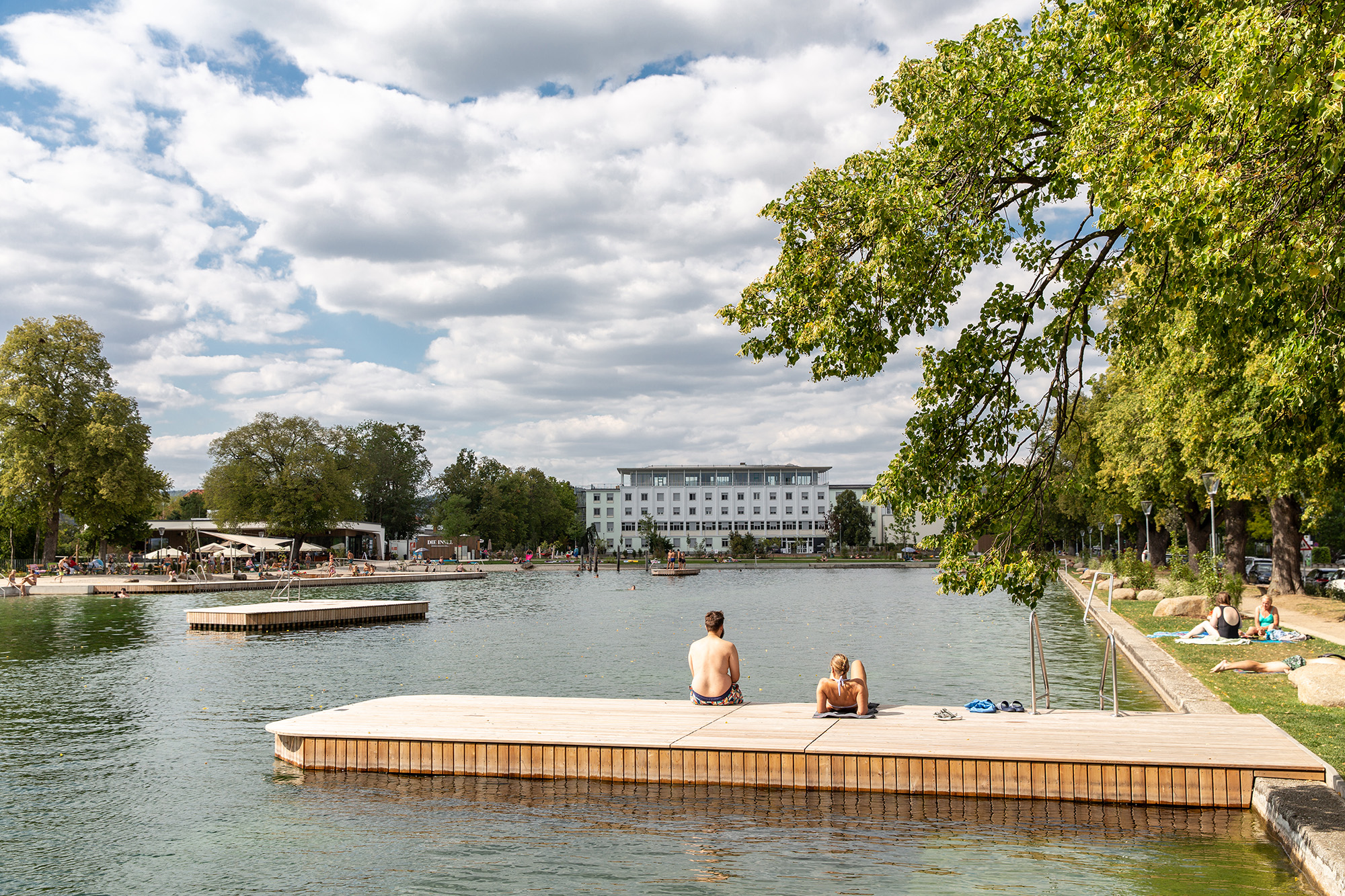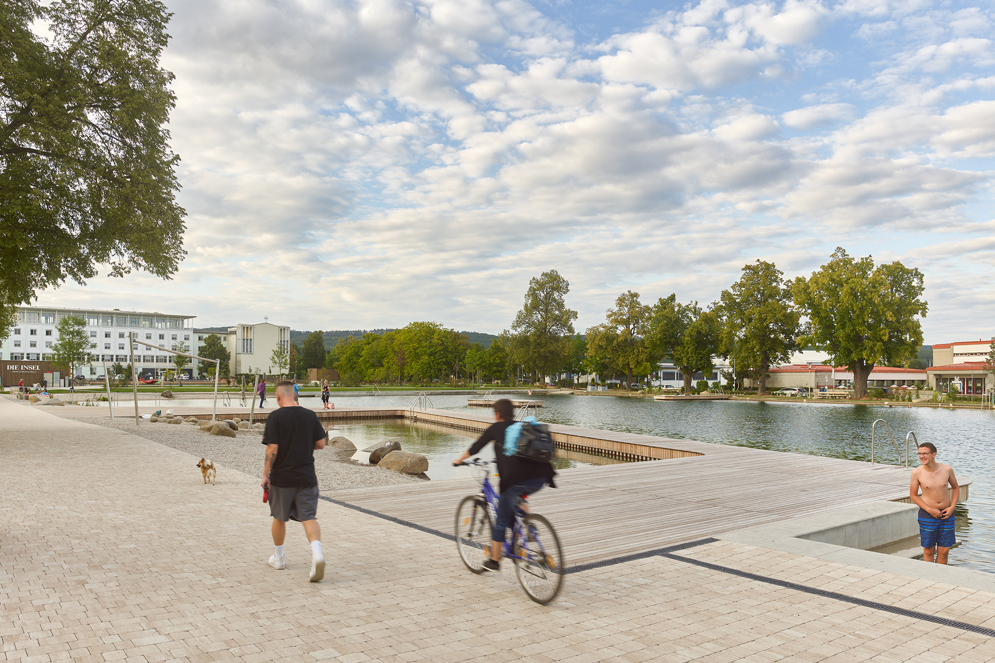 Der Stadtsee Horn wurde im Sommer 2022 nach einer umfassenden Neugestaltung feierlich eröffnet. Aus einem Freibad mit Eintrittsgeld wurde ein offener Stadtsee, der für alle und jederzeit zugänglich ist. Das Besondere an dem Projekt sind die großzügigen Holzdecks, die die Verbindung zwischen Wasser und Land herstellen, den Einstieg in den See erleichtern, viel Platz zum Verweilen bieten und sogar eine einzigartige Seebühne schaffen. Der Bereich um den Stadtsee sorgt als grüne Lunge für Abkühlung in Horn mit vielfältigen Wasserspielen, den erhaltenen und neuen Bäumen sowie hellen, Hitzereflektierenden Materialien. Mit viel Platz fürs zu-Fuß-Gehen und Radfahren ist der neue Stadtsee ein wichtiger Beitrag für eine nachhaltige Stadtentwicklung.