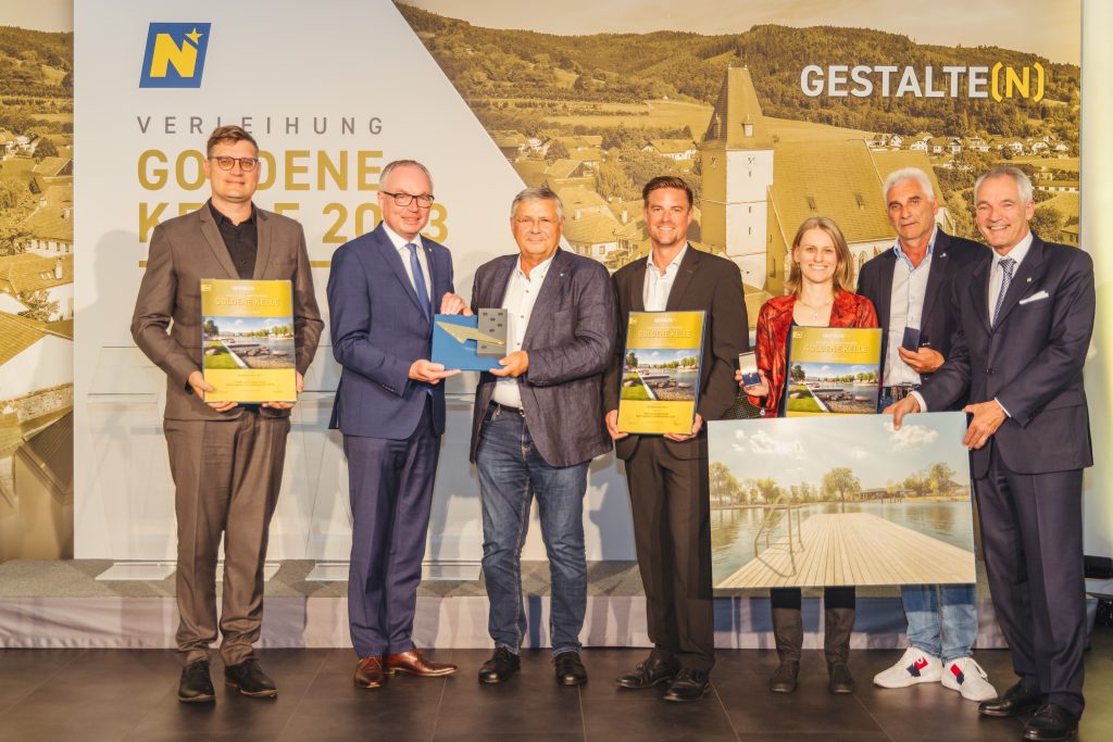 Wir sind sehr erfreut, mit dem Projekt Stadtsee Horn zu den Gewinnern der renommierten Goldene Kelle 2023 zu zählen. Die Preisverleihung fand am 4. Juni 2024 im neu gestalteten Pfarrheim von Maria Laach statt, bei der die herausragendsten Bauprojekte des Jahres in Niederösterreich ausgezeichnet wurden. LH-Stellvertreter Dr. Stephan Pernkopf überreichte die Trophäen und betonte die Bedeutung qualitätsvoller Baukultur und den behutsamen Umgang mit erhaltungswürdiger Bausubstanz.