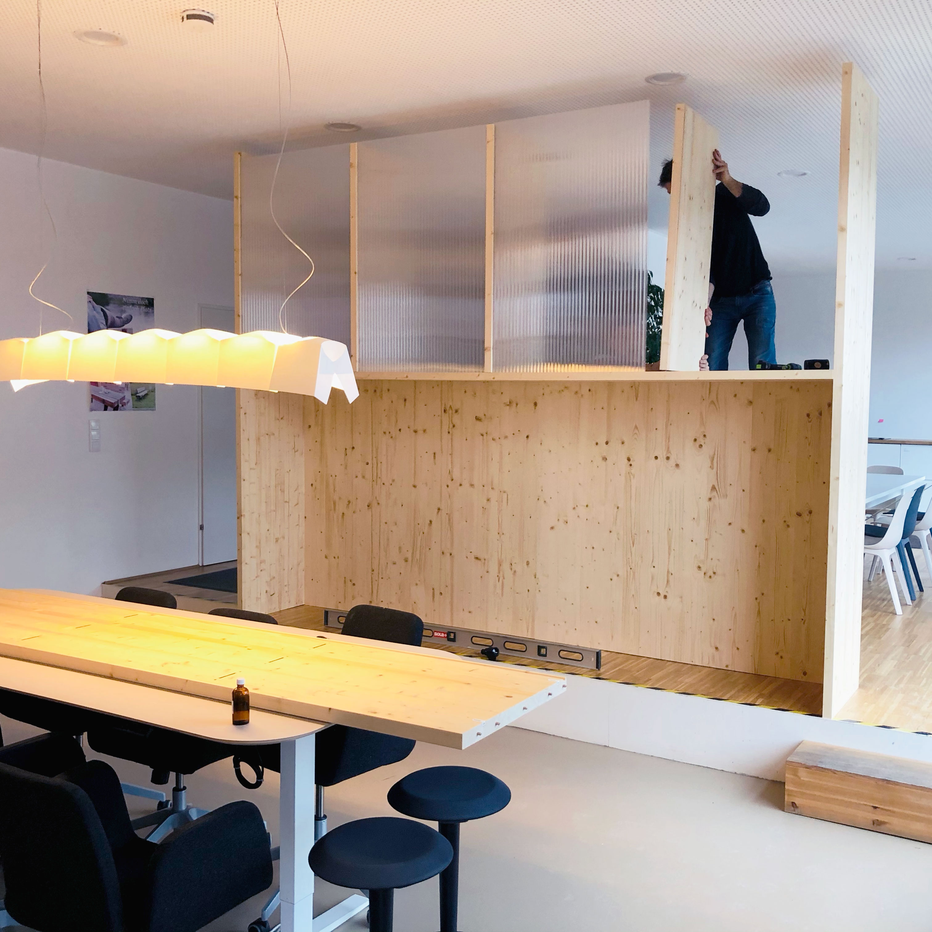 Um einen geschützten Besprechungsraum zu realisieren, haben wir eine multifunktionale Trennwand eingezogen. So entsteht ein Aufenthaltsbereich mit einer Sitznische und zugleich ein zusätzlicher Raum, der in der aktuellen Situation mehr Platz für Online-Meetings bietet. Oft sind nur kleine Eingriffe notwendig, die im Großen viel bewirken können.